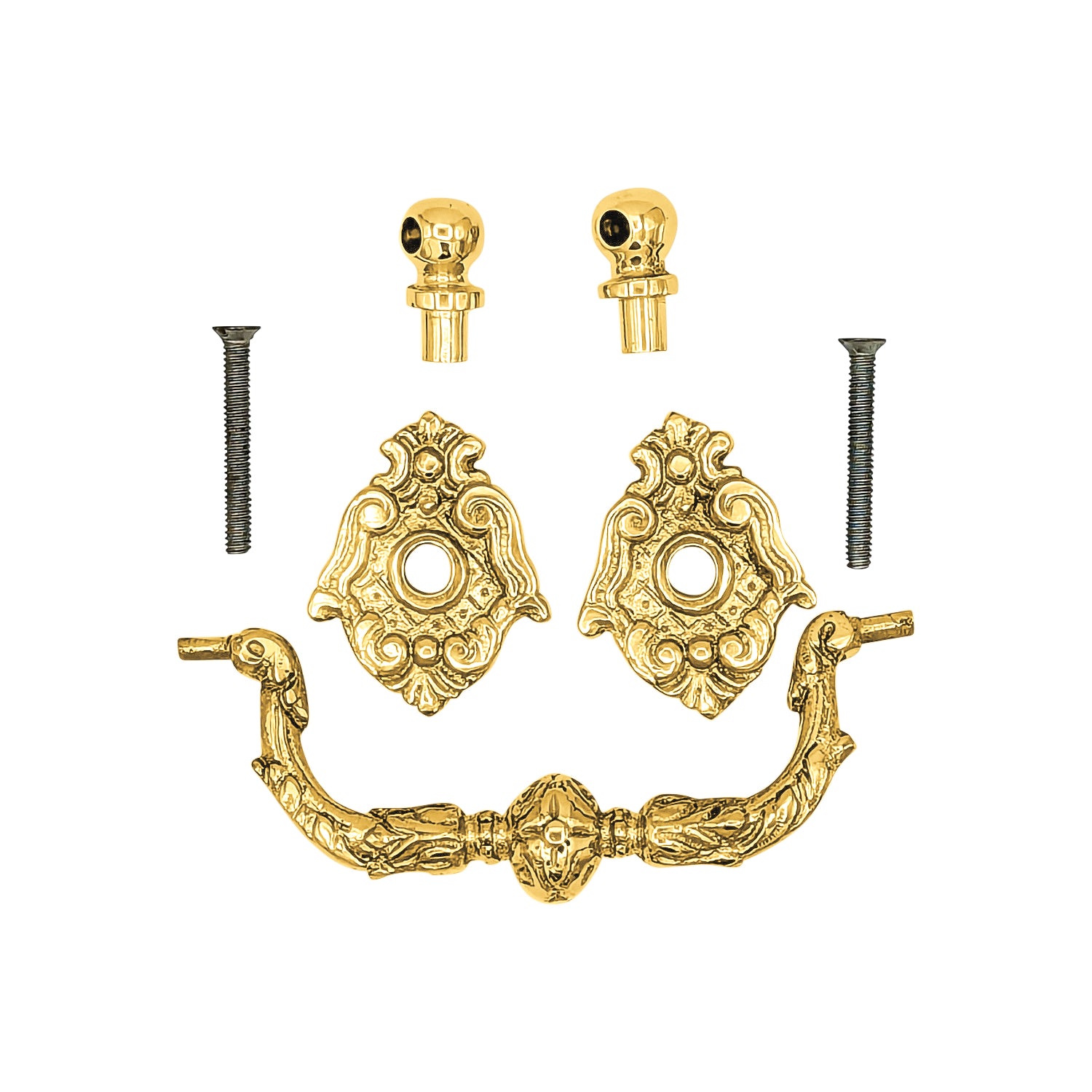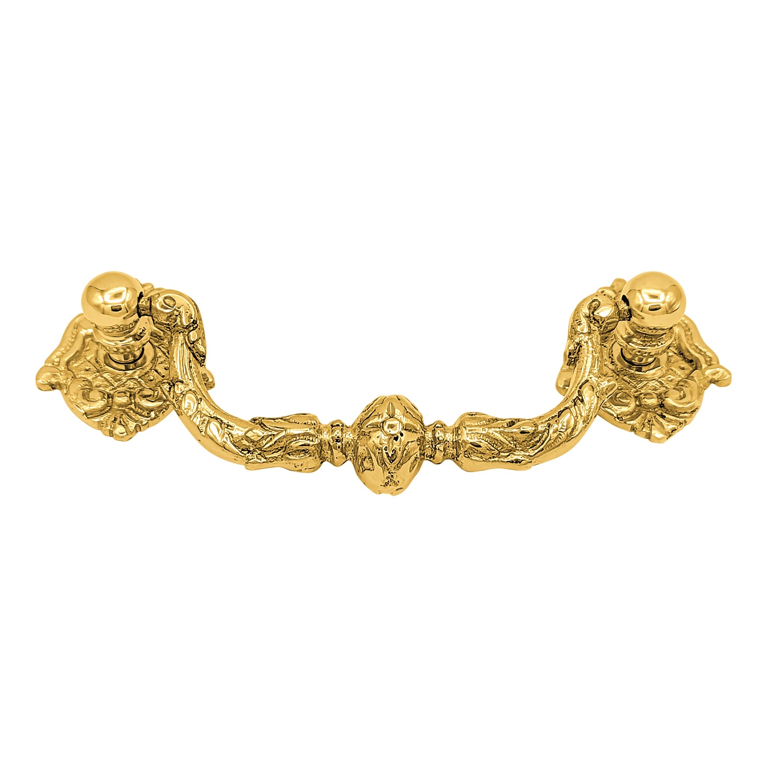 This bail handle measures 3 3/4 inch center to center mounting distance (3.75 c-c). Comes complete with the mounting hardware. Available in Polished Brass or Antique Brass.