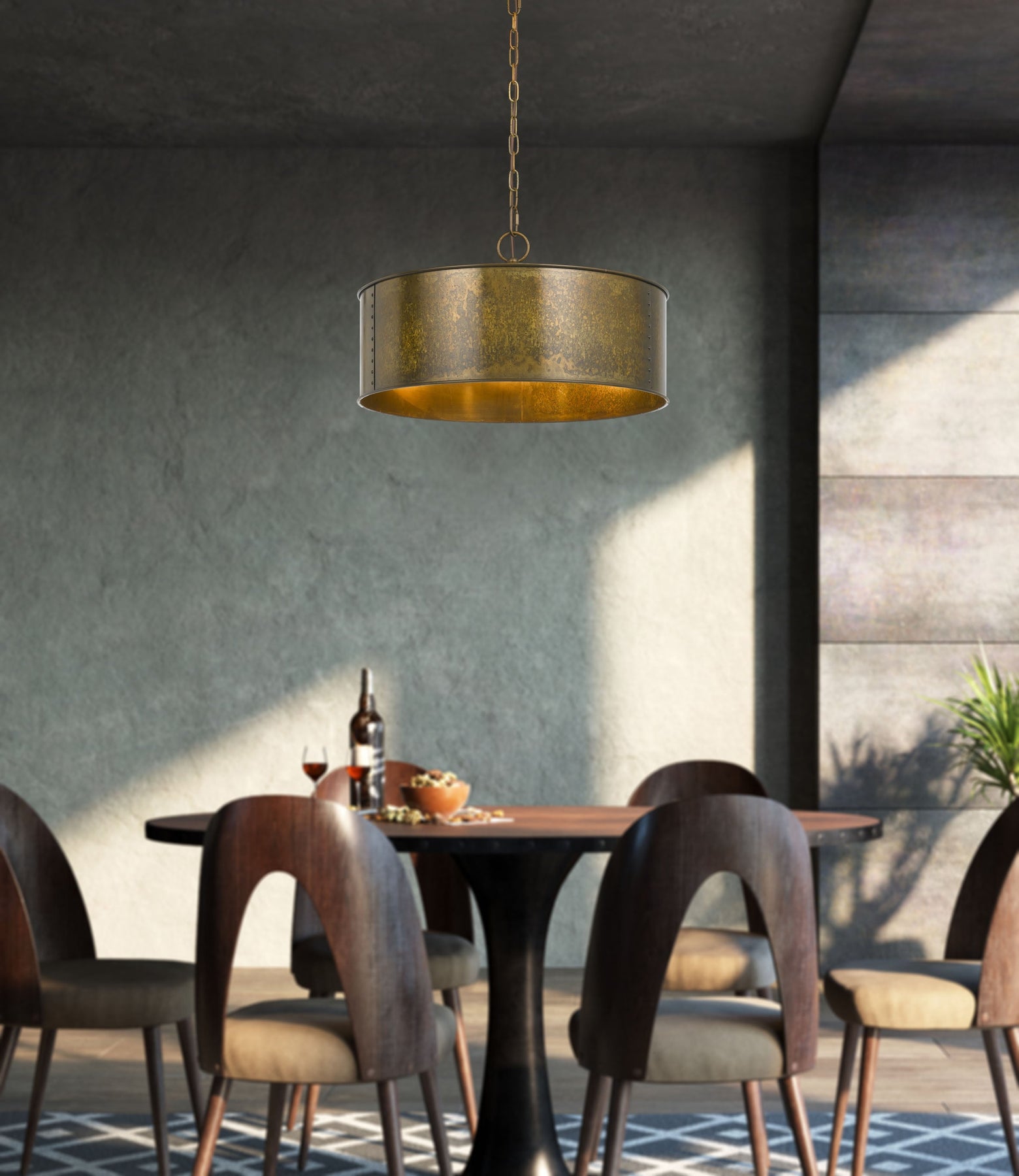 The FX-3637-3 Rochefort Metal 3 Light Chandelier is a striking addition to any decor, featuring a durable metal construction finished in a charming distressed gold. This pendant light showcases three round metal fixtures, each accommodating a 60W E26 bulb (not included), providing ample illumination for your space. It comes with a 6-foot chain and a canopy for easy installation, and requires little to no assembly. Perfect for various settings, this chandelier is designed to elevate your ambiance while offering quality and style.