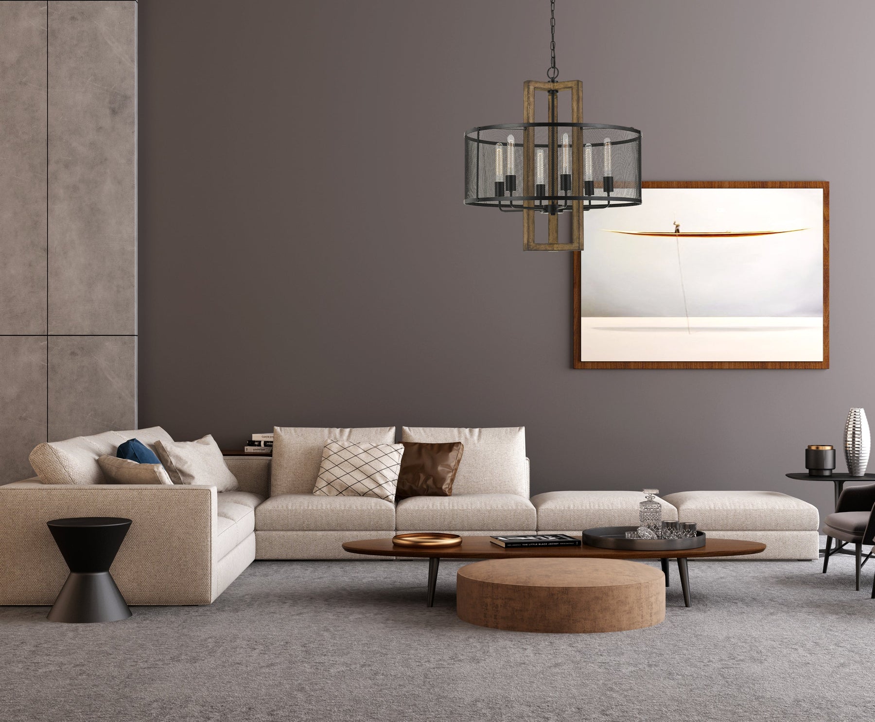 60W X 6 MONZA WOOD CHANDELIER WITH MESH SHADE (EDISON BULBS NOT INCLUDED)