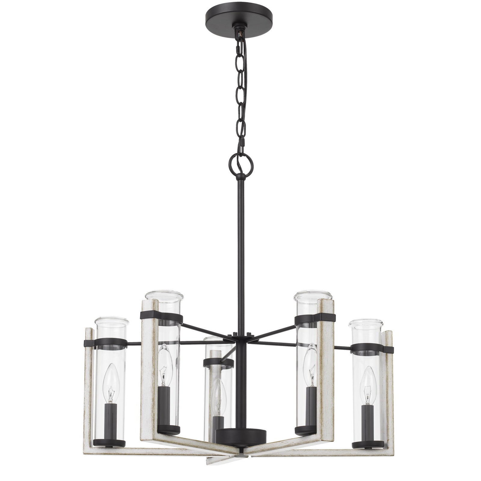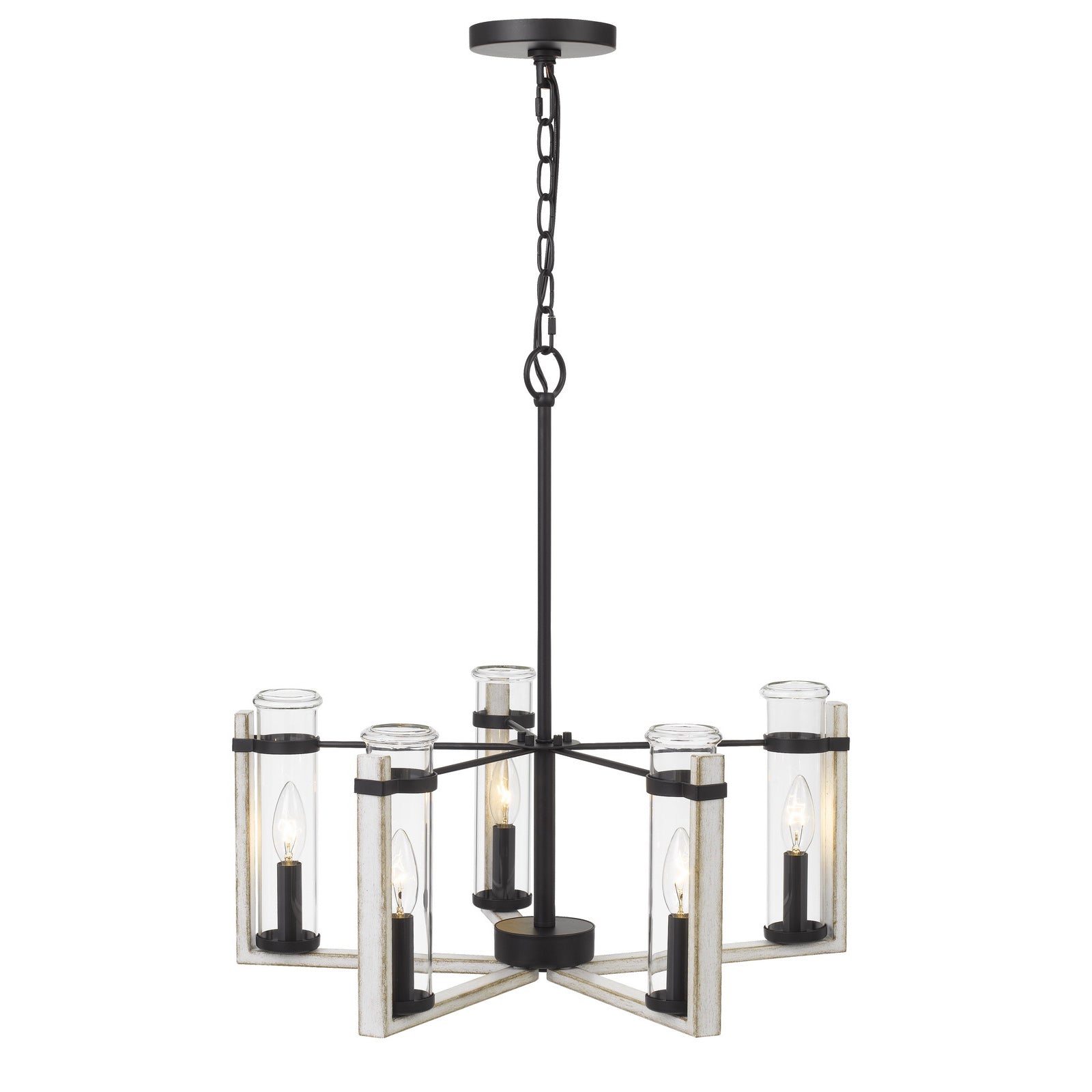 The FX-3751-5 Olivette metal chandelier is a charming addition to your home decor, featuring a stunning design that combines durability and elegance. This chandelier accommodates five E12 candelabra base bulbs with a maximum wattage of 60W each (bulbs not included). It comes equipped with a 10-foot hanging wire and a 6-foot chain for versatile installation options. The fixture showcases a nostalgic test tube glass design and a white-washed wood finish, bringing a refreshing and vintage look to any space. Minor assembly is required, and it is backed by a one-year warranty, ensuring peace of mind in your purchase.