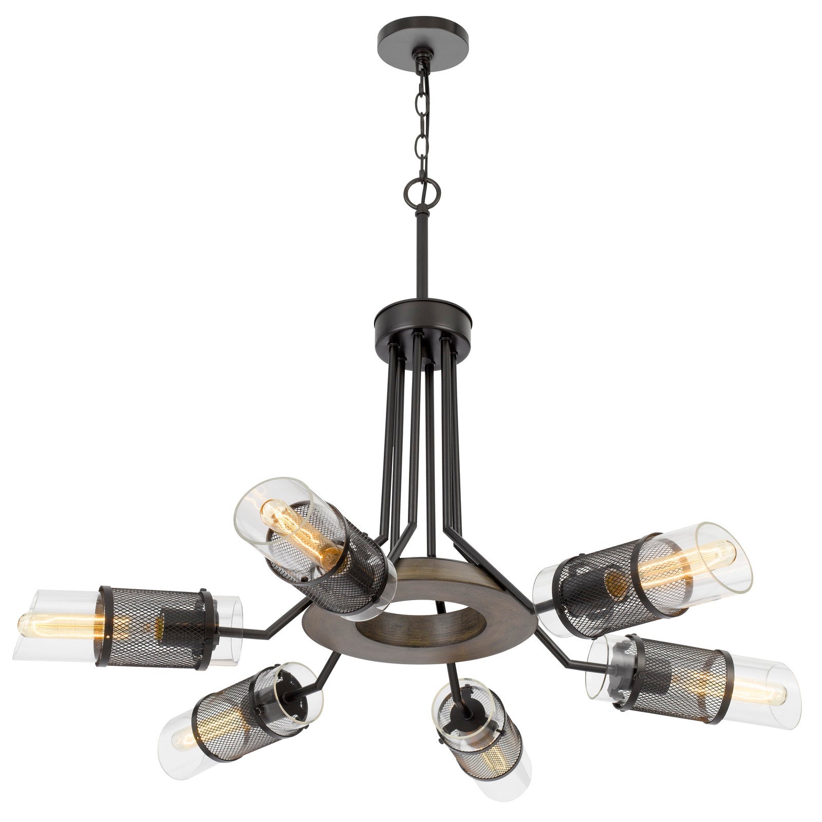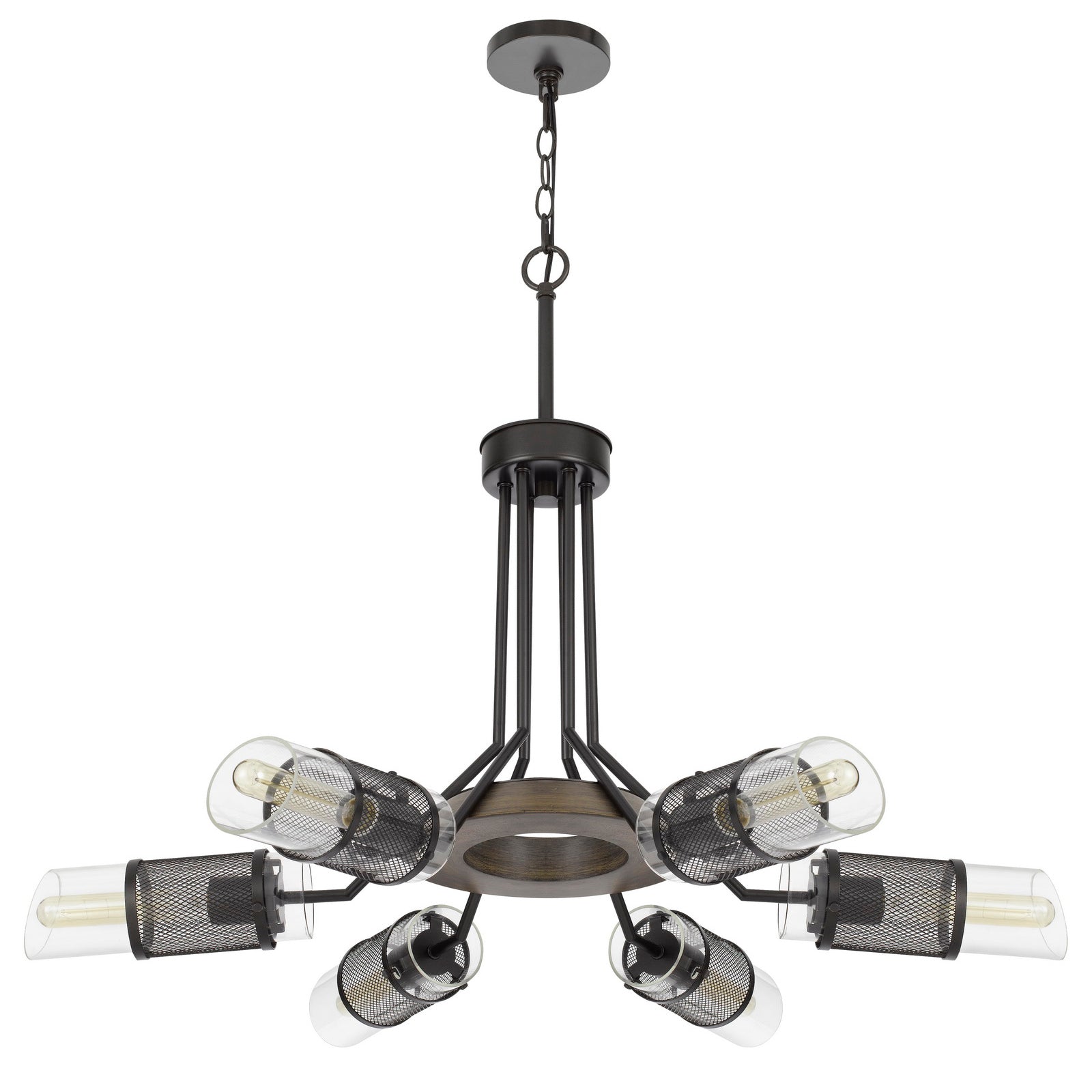 60W X 6 SAVONA PINE WOOD/METAL CHANDELIER WITH DOUBLE LAYER GLASS/METAL MESH SHADE. (EDISON BULBS NOT INCLUDED)