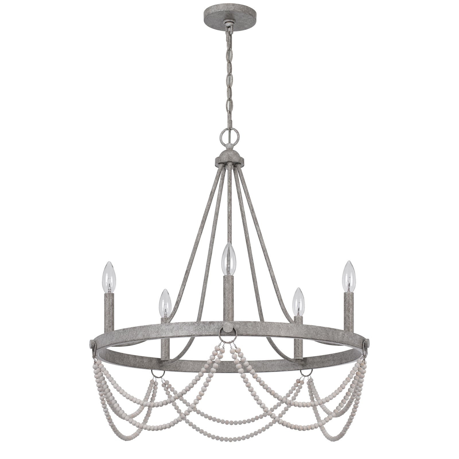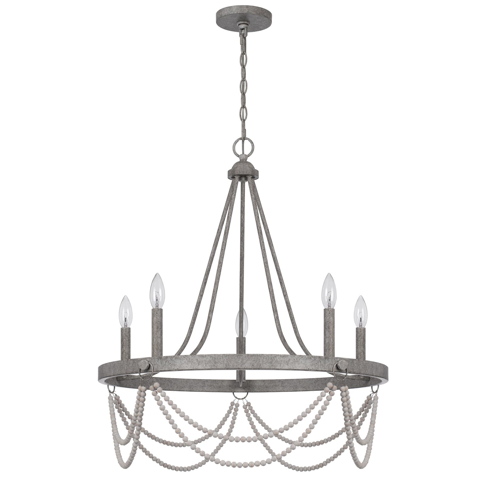 The FX-3791-5 Anniston beaded metal chandelier combines timeless elegance with functional design, making it a perfect addition to your home. This durable chandelier features a traditional candelabra design, providing light through five E12 base bulbs (not included), with a maximum wattage of 60W each. It boasts beautiful white wash beaded accents and a distressed finish that enhances its French country charm. The chandelier includes a canopy and a 6-foot chain for easy installation, making it suitable for various spaces. With dimensions measuring 28.00 inches in length, 9.50 inches in width, and 28.30 inches in height, this chandelier is sure to be a stunning focal point in any room.