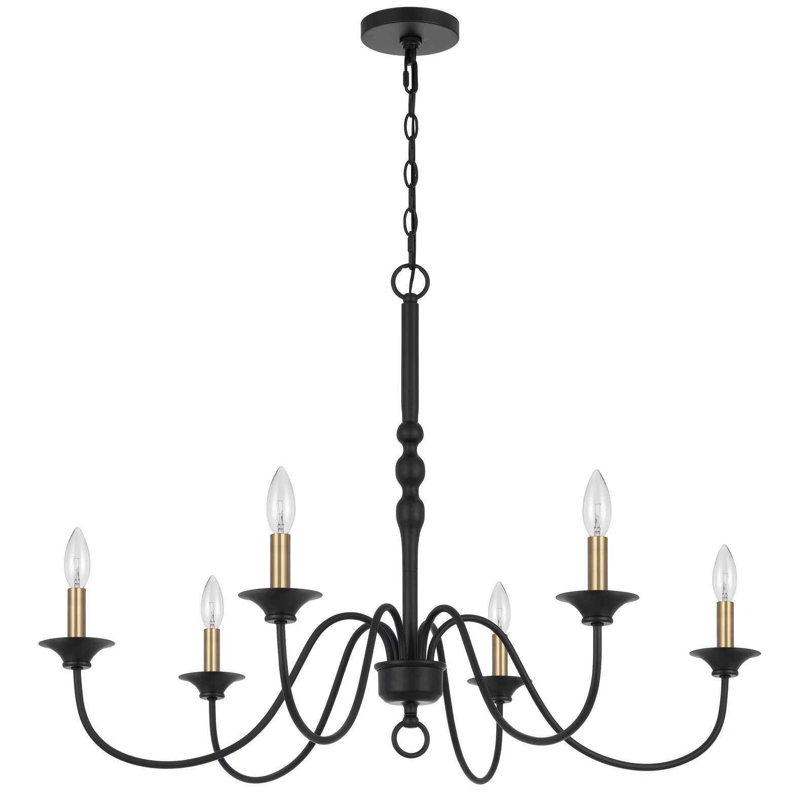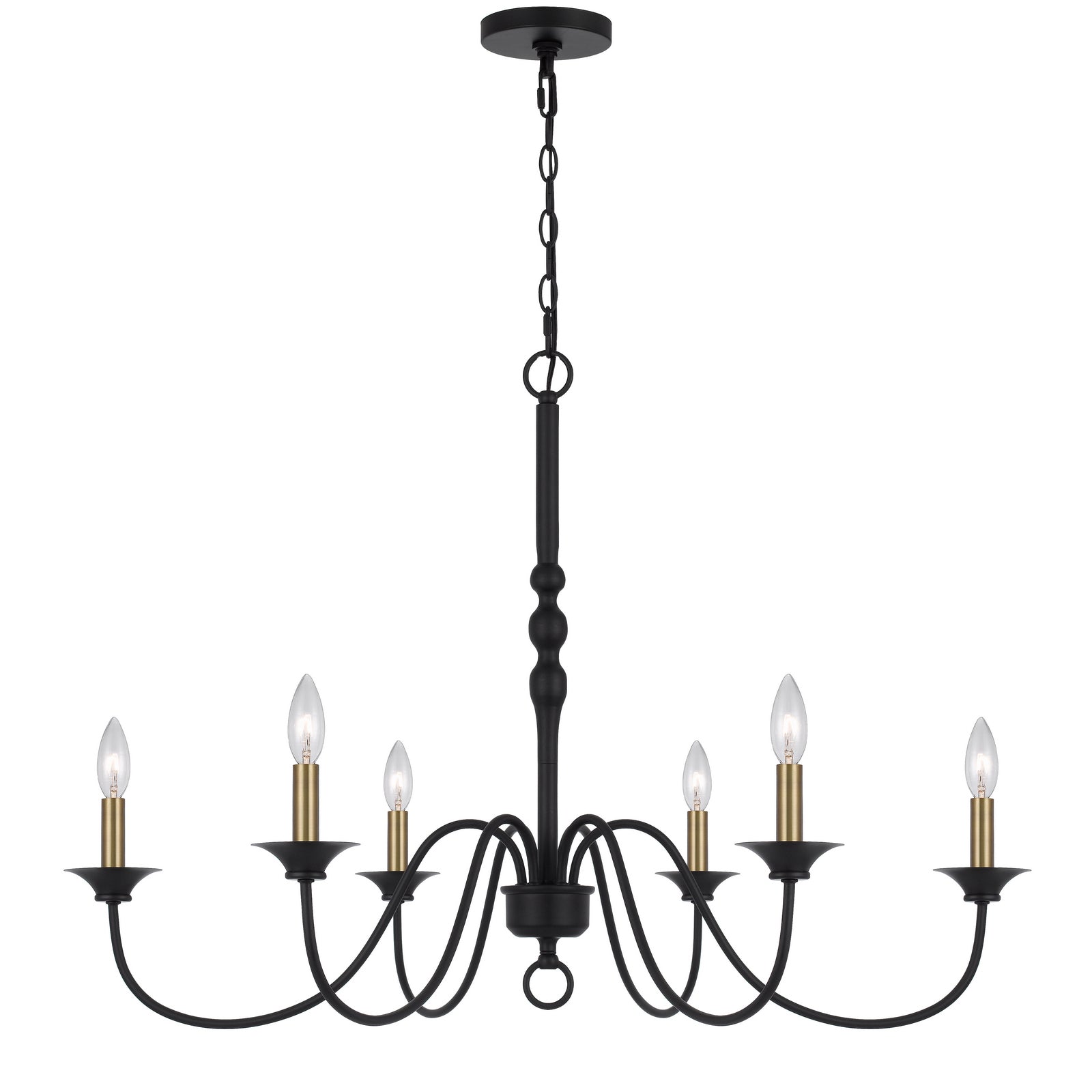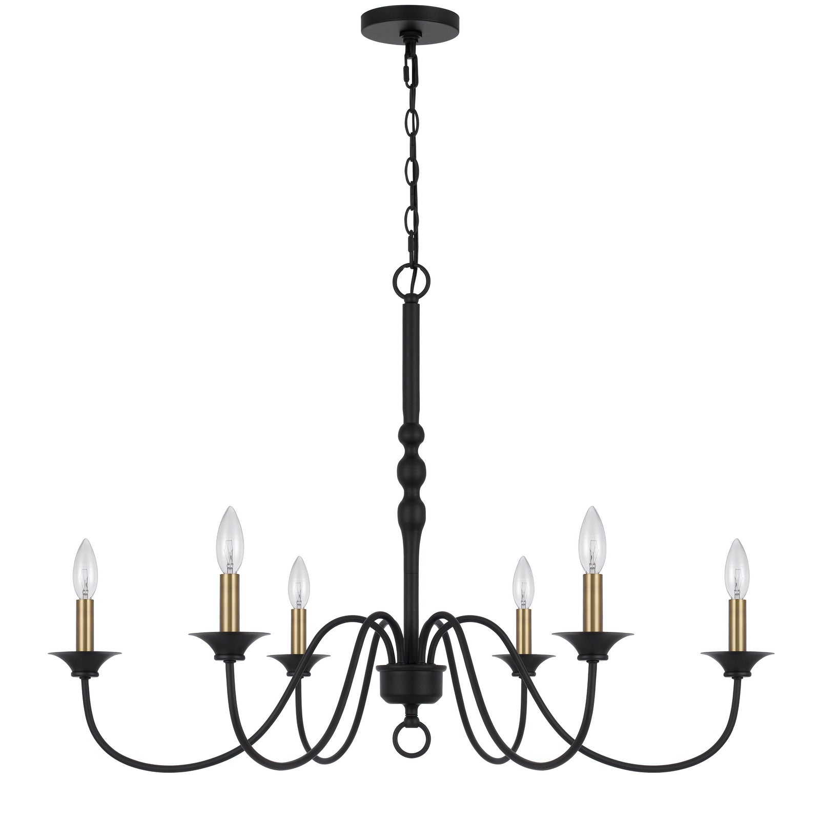 The FX-3794-6 Marino Metal Chandelier is a stunning addition to any room, harmonizing French country charm with modern elegance. This chandelier features a durable metal construction and showcases six uplights in a classic candelabra style, each accommodating a 60W E12 bulb. It is adorned with antique brass candelabra sleeve accents and finished in a sleek satin black, creating a striking visual appeal. The chandelier comes complete with a canopy, a 6-foot chain, and 10 feet of electrical wiring, ensuring easy installation. With a package dimension of 36.80\