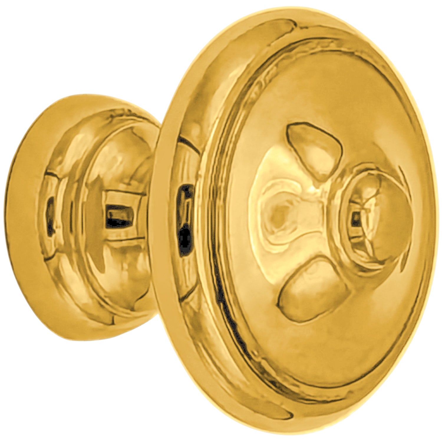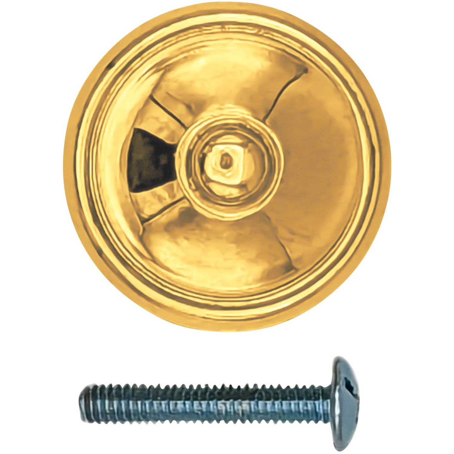 This simple Colonial style knob will add a classic touch to your cabinets and drawers. Measures 1 1/4 inch in diameter with a projection of 1 inch. This product is available in several other finishes and comes complete with mounting hardware. Available in several different finishes including polished brass, antique brass and Black Bronze.