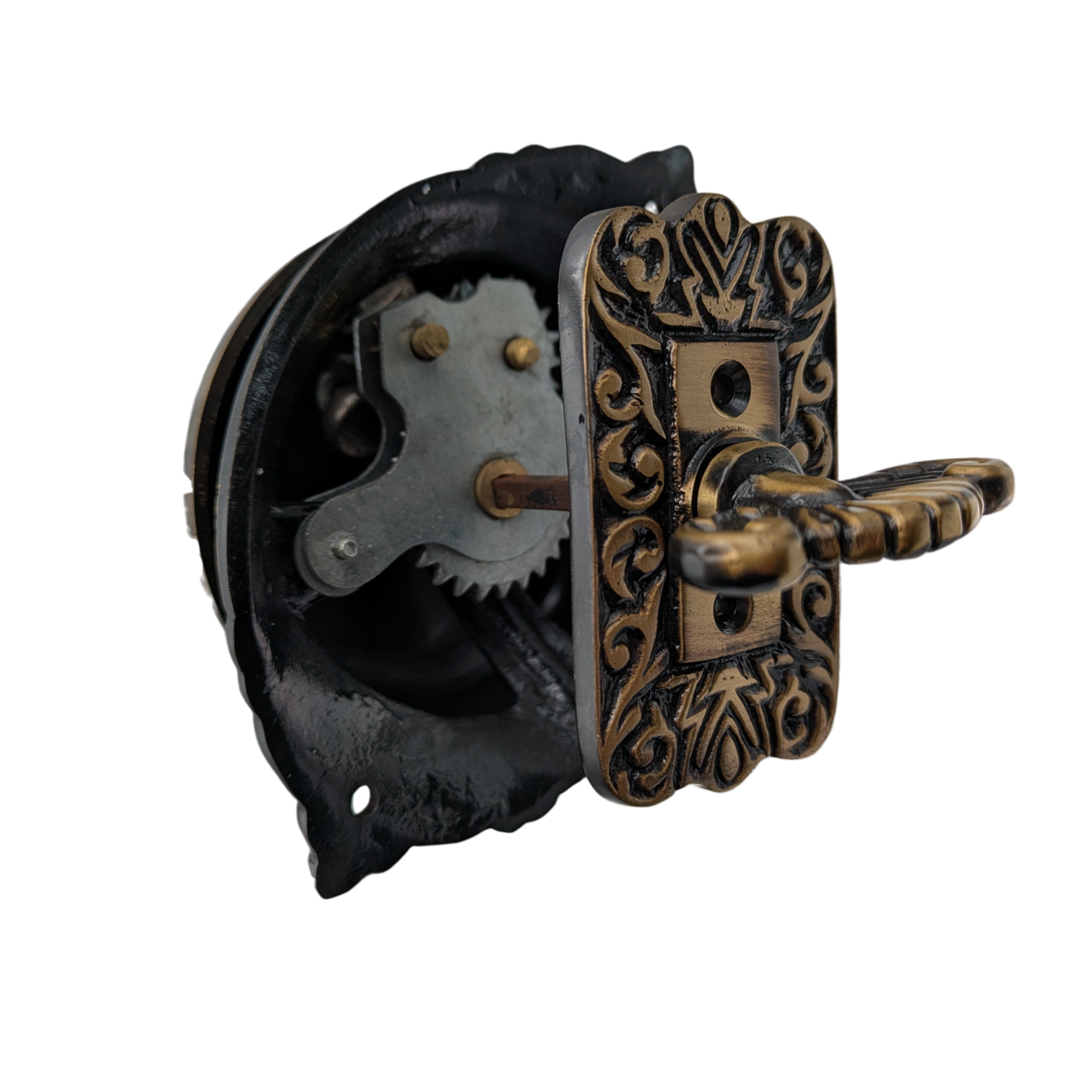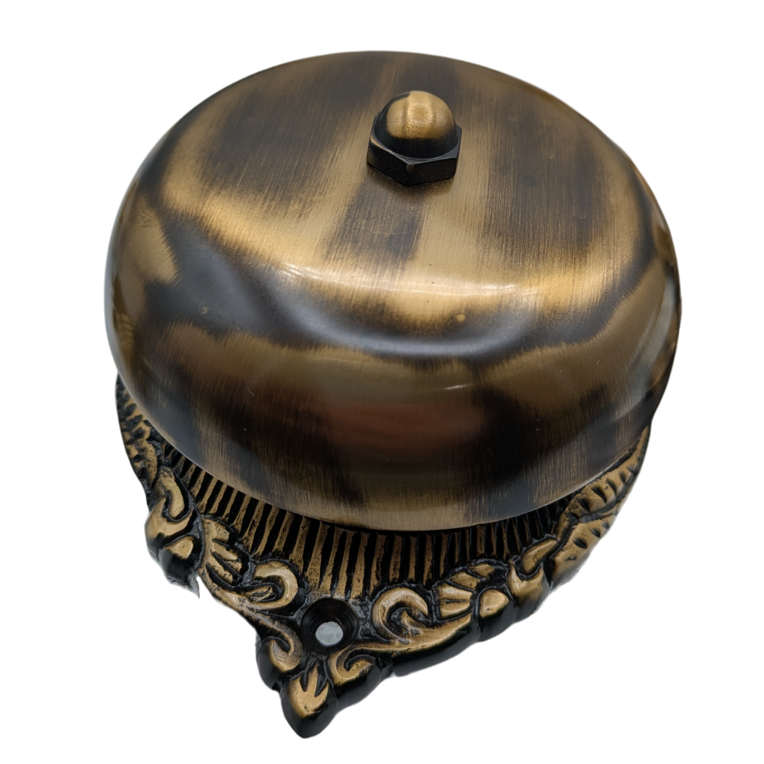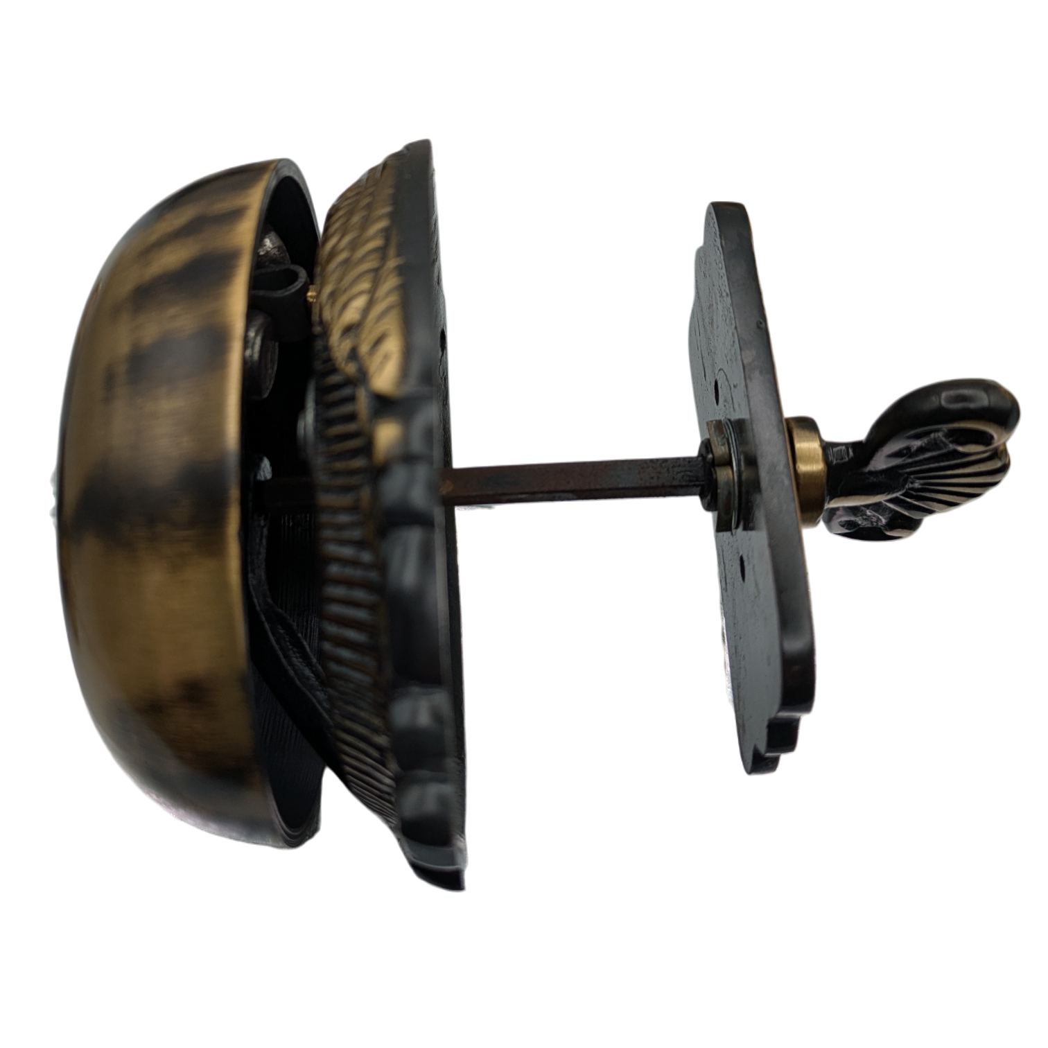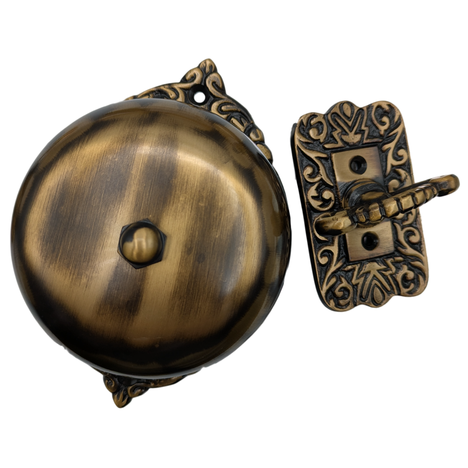 This door bell measures 5 3/8 inches tall with 4 inch mount spacing. Comes with the solid brass bell, steel mechanism, external TURN mechanism and mounting hardware. Solid brass construction - unlacquered brass that will patina naturally over time. These are made for doors up to a thickness of 1 3/4 inches (thinner doors may require you to trim the connecting rod). The average lead time for this particular product is 2 to 4 Business Days.