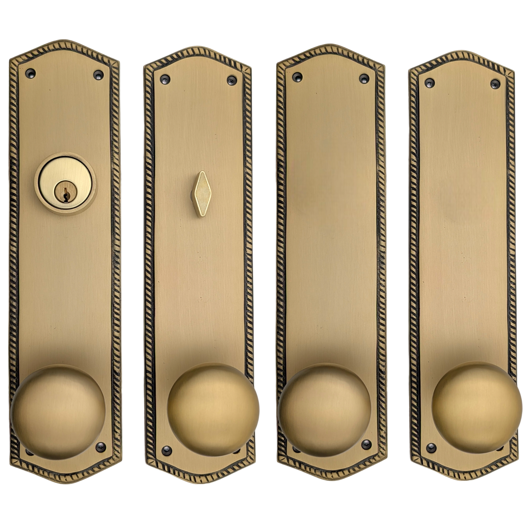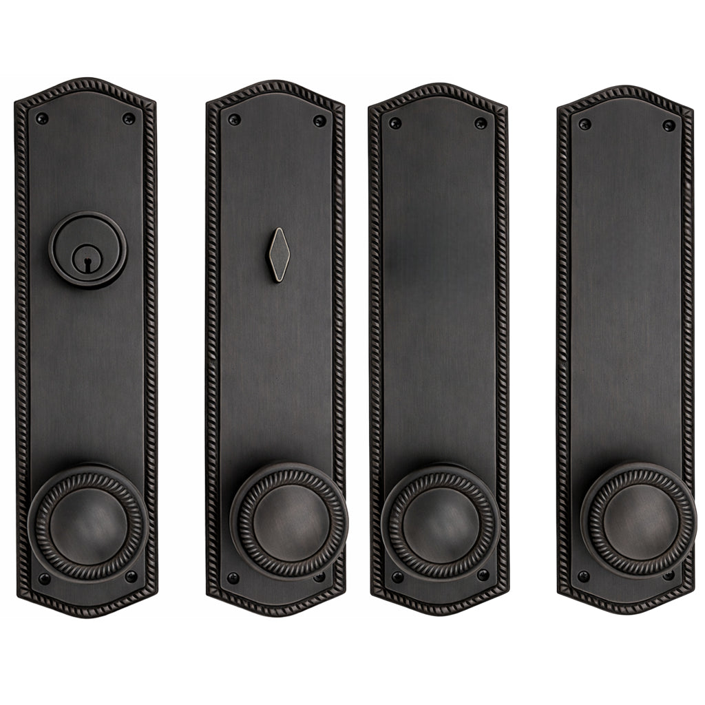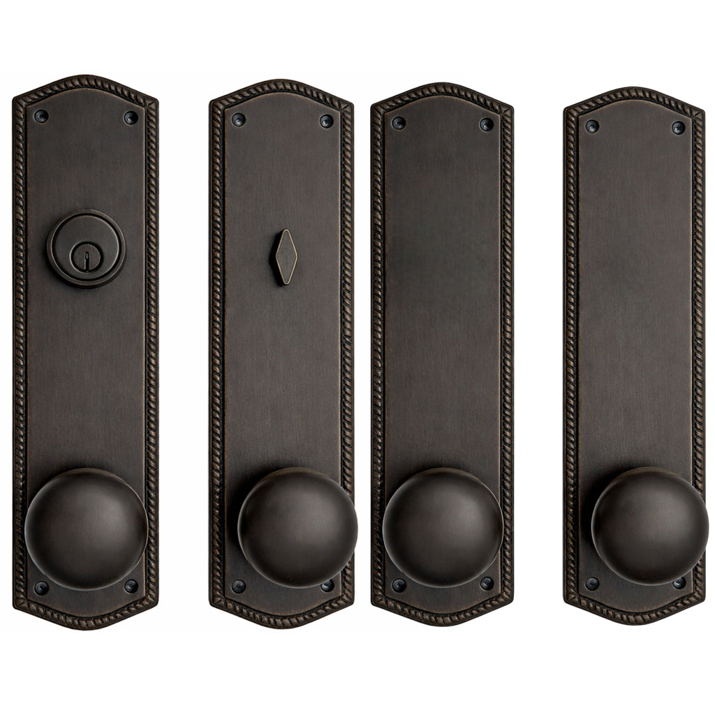This solid brass double-door entryway set measures 3 inches wide by 12 inches tall. Choose the brass knob style that best complements your home. The standard center-to-center distance from the deadbolt to the knob is 5 1/2 inches, with other spacing options available upon request as a custom order.