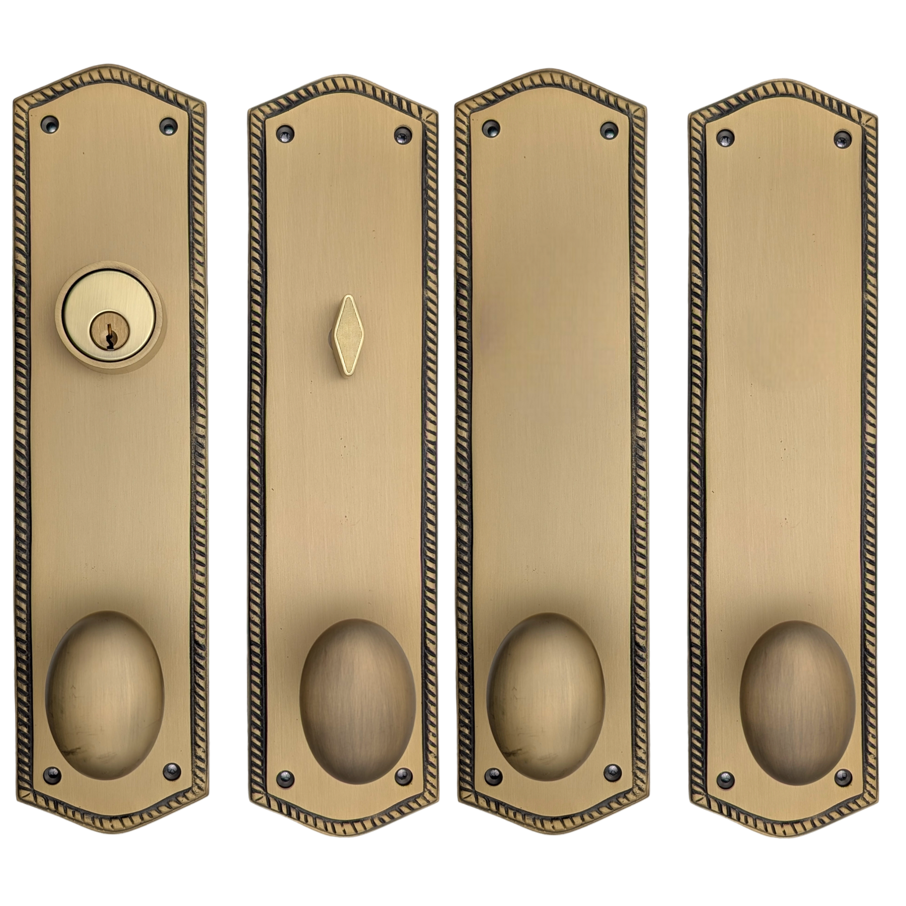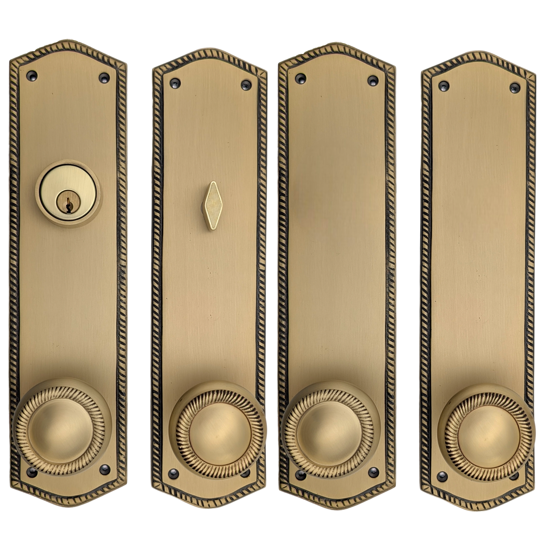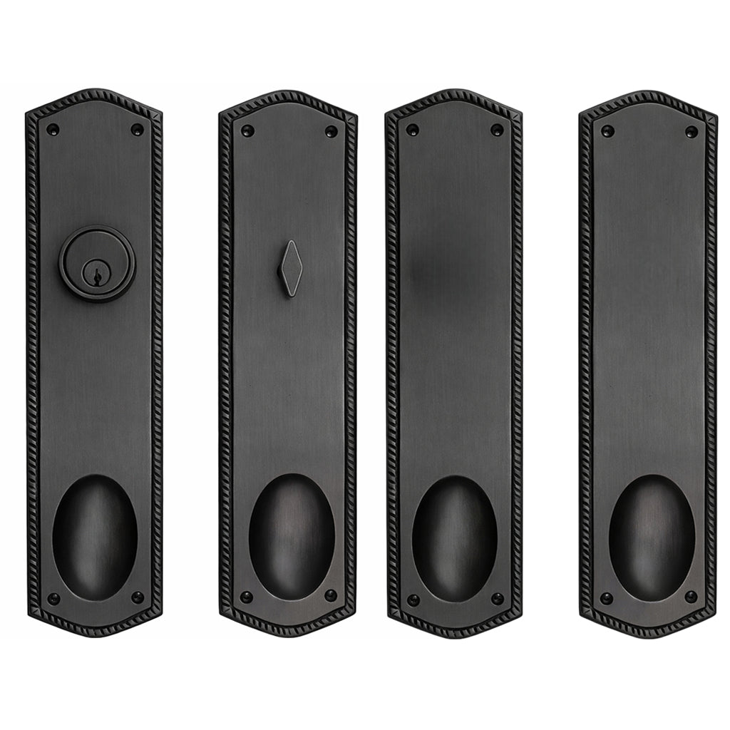 This solid brass double-door entryway set measures 3 inches wide by 12 inches tall. Choose the brass knob style that best complements your home. The standard center-to-center distance from the deadbolt to the knob is 5 1/2 inches, with other spacing options available upon request as a custom order.