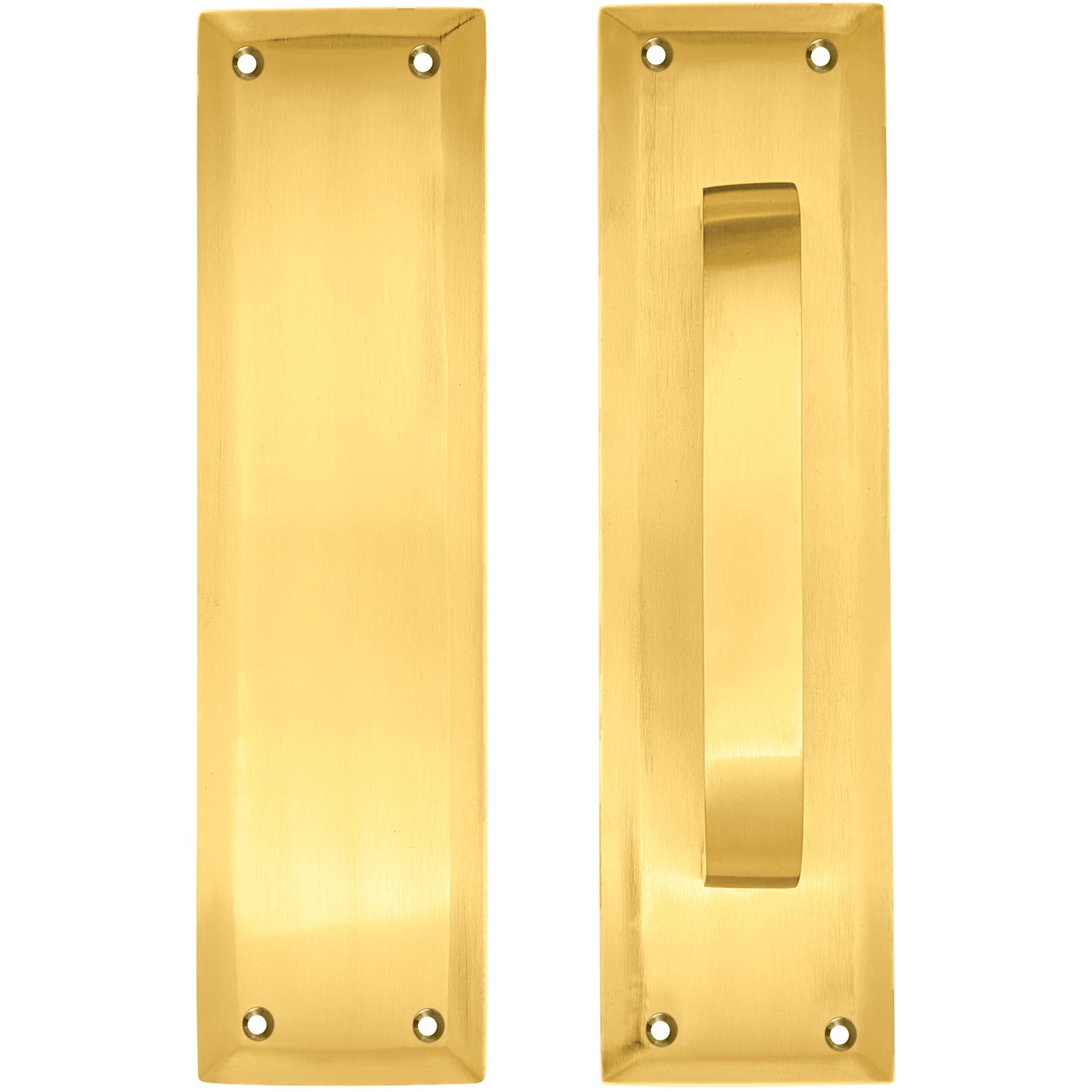 This Pull and Push Plate set measures 2 3/4 inches wide by 10 inches tall. This set comes complete with mounting hardware, and is constructed from solid brass for decades of use. Available in polished brass, antique brass, matte black, Black Bronze, antique nickel, polished chrome, and Satin Nickel. This particular product has a lead time of approximately 4 to 5 business days.