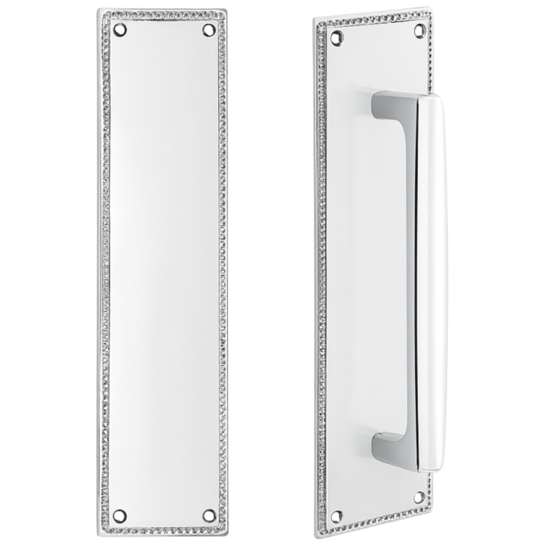 This push & pull door set is designed for any door in your home or business (such as entryway or hallway doors). It is constructed from solid brass and measures 3 inch wide by 12 inches tall. The handle C-to-C measures 8 Inches. The handle is Concealed Surface mounted. Comes in a variety of finishes.