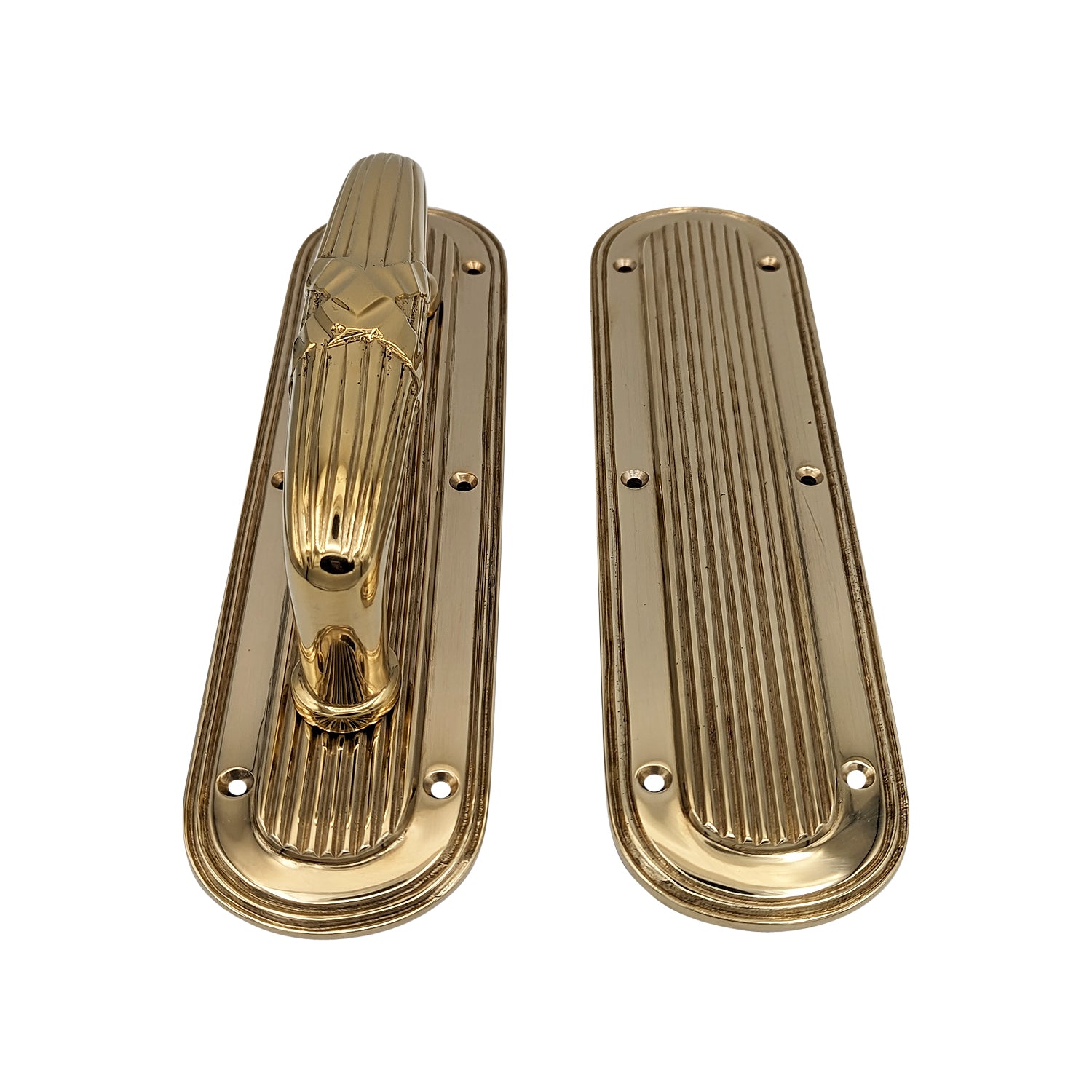 This Art Deco  pull and push plate set features a sleek elongated form with rounded ends, highlighted by elegant vertical ridges that add texture and depth. Crafted in solid brass, it captures the glamour of early 20th-century design. Perfect for adding a touch of sophistication, it blends timeless functionality with decorative appeal.