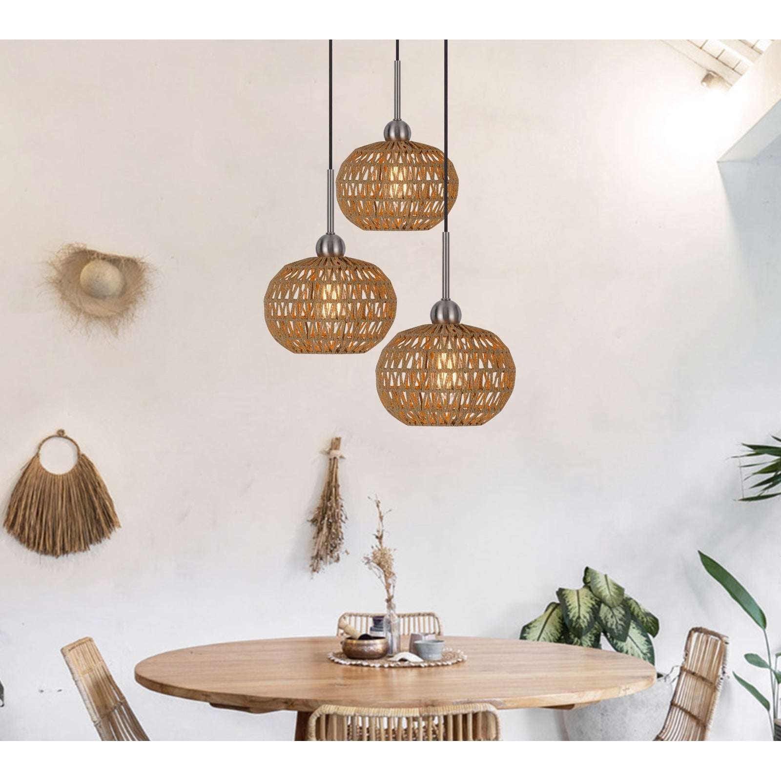 The FX-3783-1 60W Medan Roped Pendant Fixture is an ideal choice for enhancing your space with a touch of rustic elegance. Crafted with durable metal and a woven brown rope, this pendant features a canopy and includes a six-foot adjustable cord for optimal hanging length. Designed to accommodate one E26 base bulb (not included), it delivers a warm and inviting illumination. With dimensions packaged at 12.30 x 12.30 x 12.80 inches and a warranty of one year, this fixture combines functionality with style, making it suitable for various interiors.