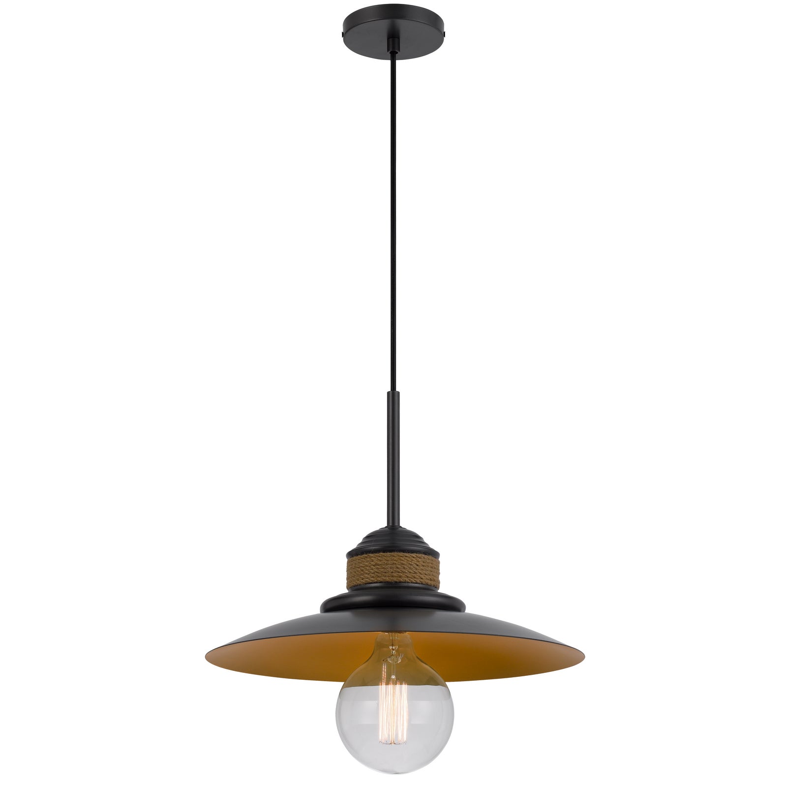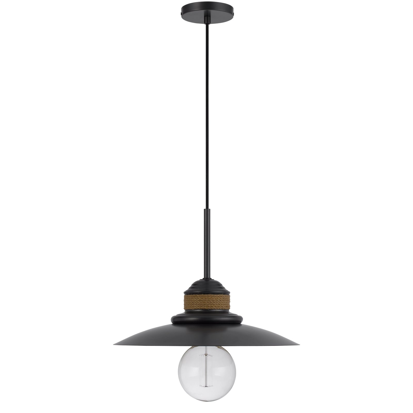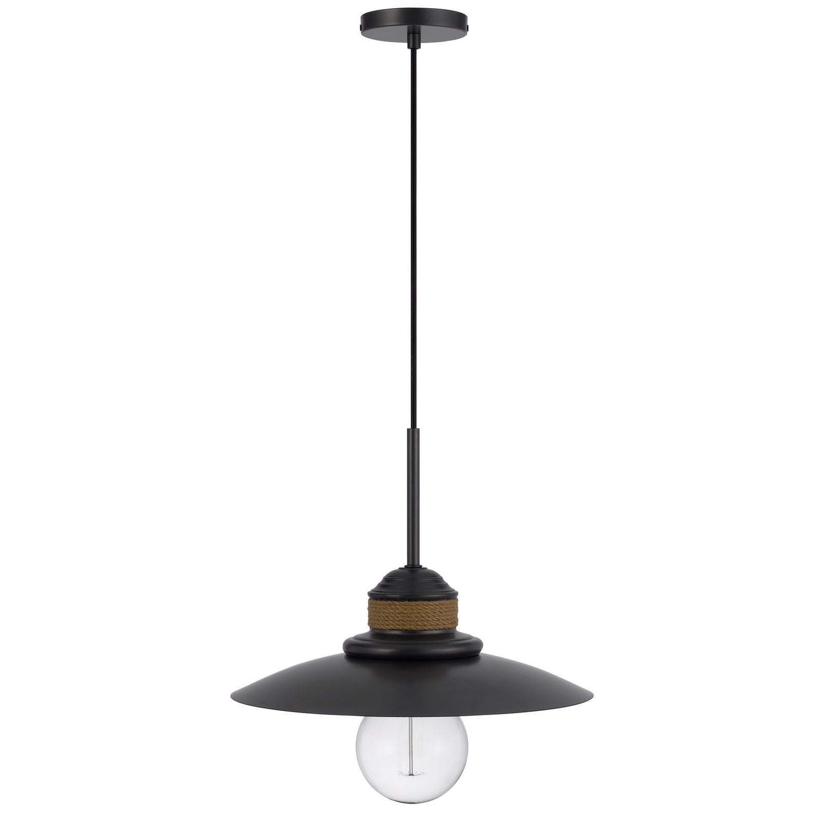The FX-3802-1 Mineola Metal Mini Pendant combines durability and style, featuring a rustic burlap design and sturdy metal construction. This industrial pendant light accommodates one E26 bulb with a maximum wattage of 60W. It comes with an included canopy and adjustable height, complemented by charming rope accents. The light is designed to ship in one carton with a six-foot cord, making it versatile for various spaces. Assembly is required, and it comes with a one-year warranty, ensuring it is free from defects in materials and workmanship.