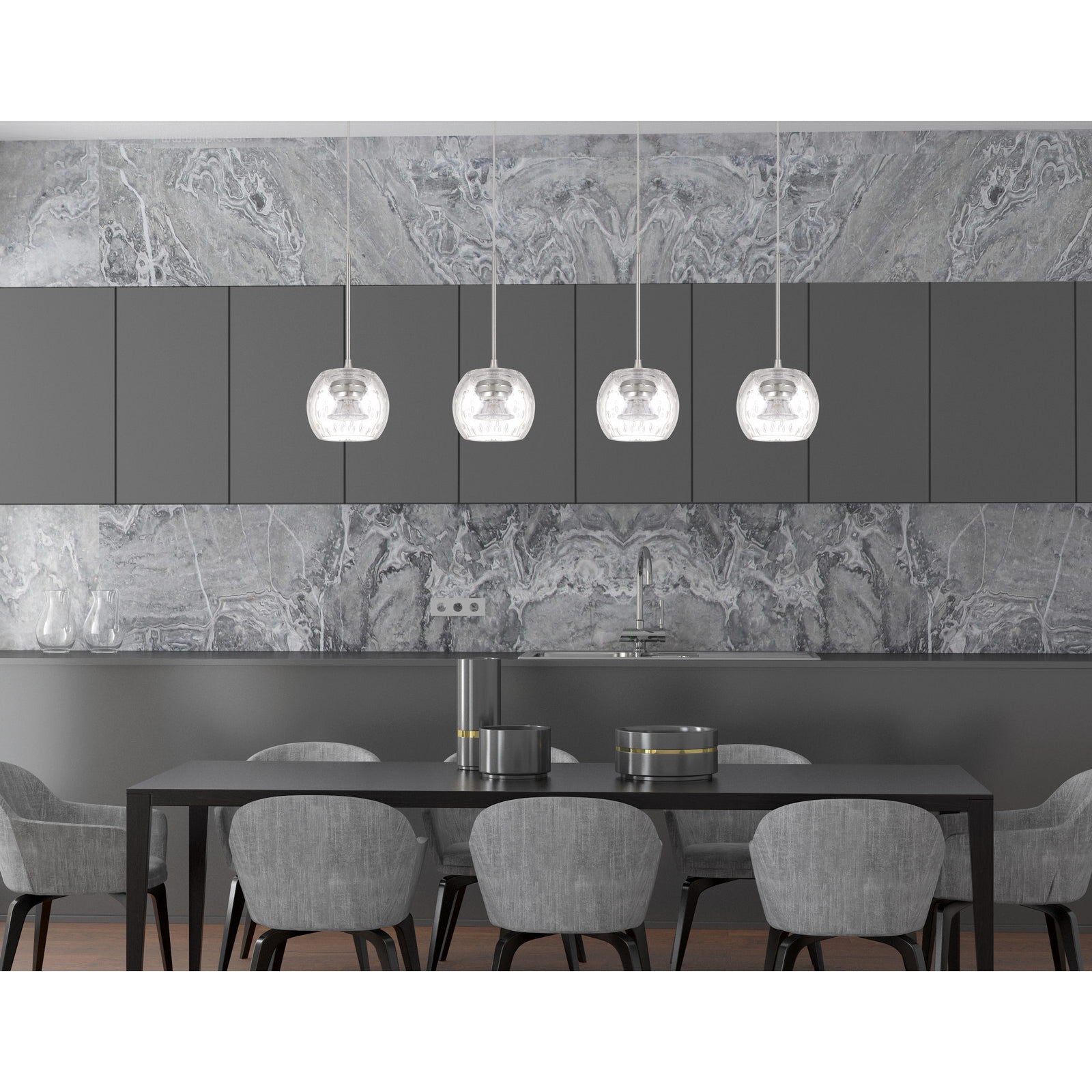 The Ithaca Mini Pendant in Brushed Steel is an elegant lighting fixture that effortlessly combines style and functionality. This dimmable LED pendant features a clear bulbbed glass design and emits a warm 3000K light temperature. It delivers an impressive 700 lumens with an 8W LED, achieving a high 90 CRI for exceptional color rendering. The durable metal and glass construction ensures longevity, and installation is easy with the included 5\