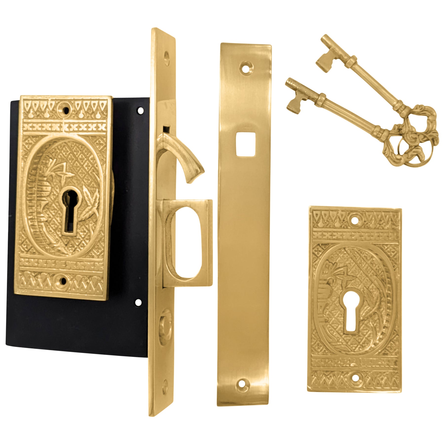 This stylish pocket door set is designed for a locking pocket door. The flush pulls arPOCKET DOORe installed on either side of the door and the mortise latch/edge pull pull is installed into the side of the door to pull the door shut easily and can lock into the door jamb. Locking systems require doors with at least 1 3/4'' thickness. This pattern is called "Broken Leaf" and features a classic earlier twentieth century pattern that emphasized more geometric shapes and a carved design. The lock boxes measure approximately 3 1/4 inches deep (including lip) and 5 1/8 inches high. The lock has a 2 inch backset. Works with a standard skeleton key and comes complete with an ornate set of skeleton keys. The average lead time for this particular product is 20 weeks depending upon the finish chosen.