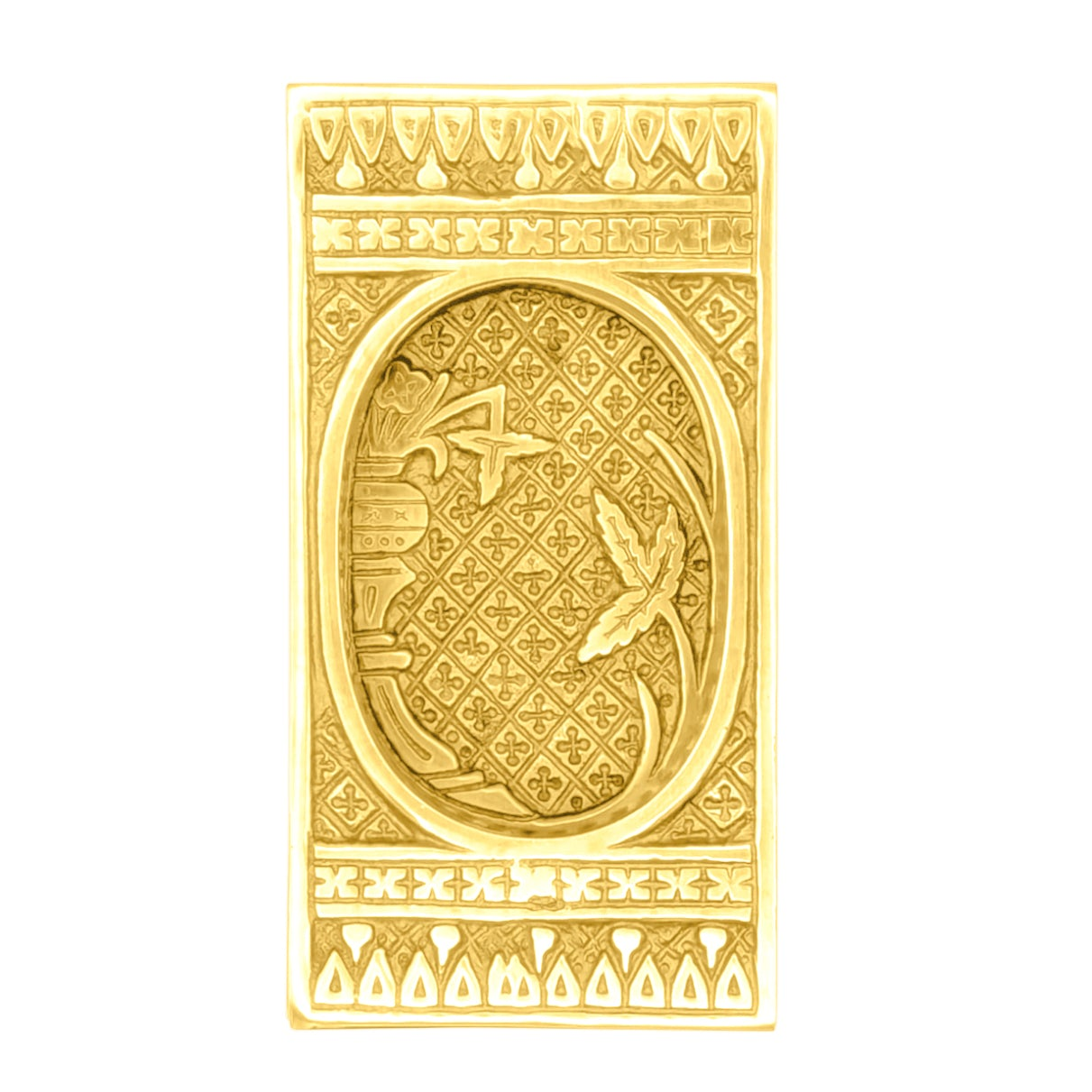 Measuring approximately 4 1/5 inches tall by 2 1/4 inch wide and crafted from solid brass, this detailed hardware piece comes complete with complementary screws, ensuring easy installation with all the necessary mounting hardware included. For a flush finish, routing may be necessary.