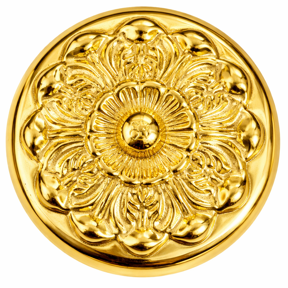 This knob measures 2 inches in diameter with a projection of 1 inch (approximate). Comes complete with the mounting hardware. This product comes as an unlacquered natural brass and it will patina over time. A high strength lacquer coating is available upon request. Available in polished chrome, polished nickel, and Satin Nickel.