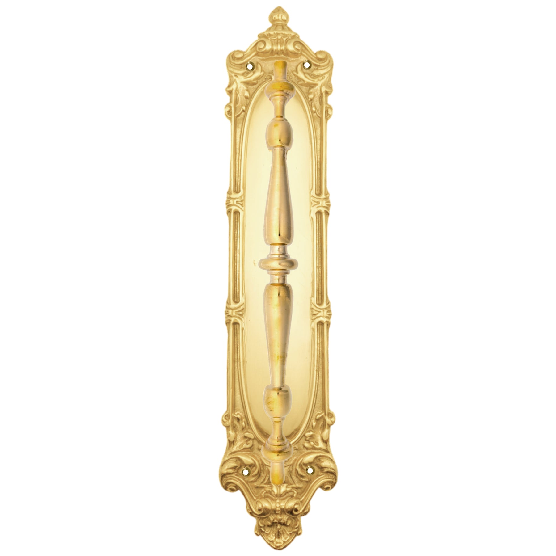 The gorgeous pull plate shown here is Victorian in style. This plate measures approximately 14 1/2 inches tall and 3 inches wide. The pull measures approximately 9 3/4 inches long and has a projection of 2 1/4 inches. Hand cast and available in three custom finishes including Polished Brass, Antique Brass, and Oil Rubbed Bronze. Comes complete with mounting hardware. This particular product has a lead time f 2 to 4 business days.