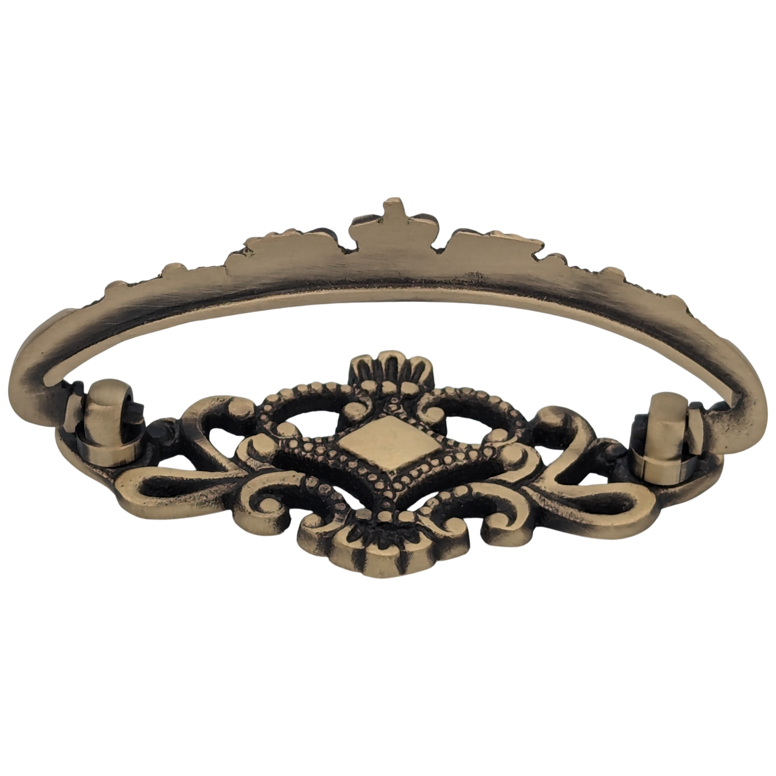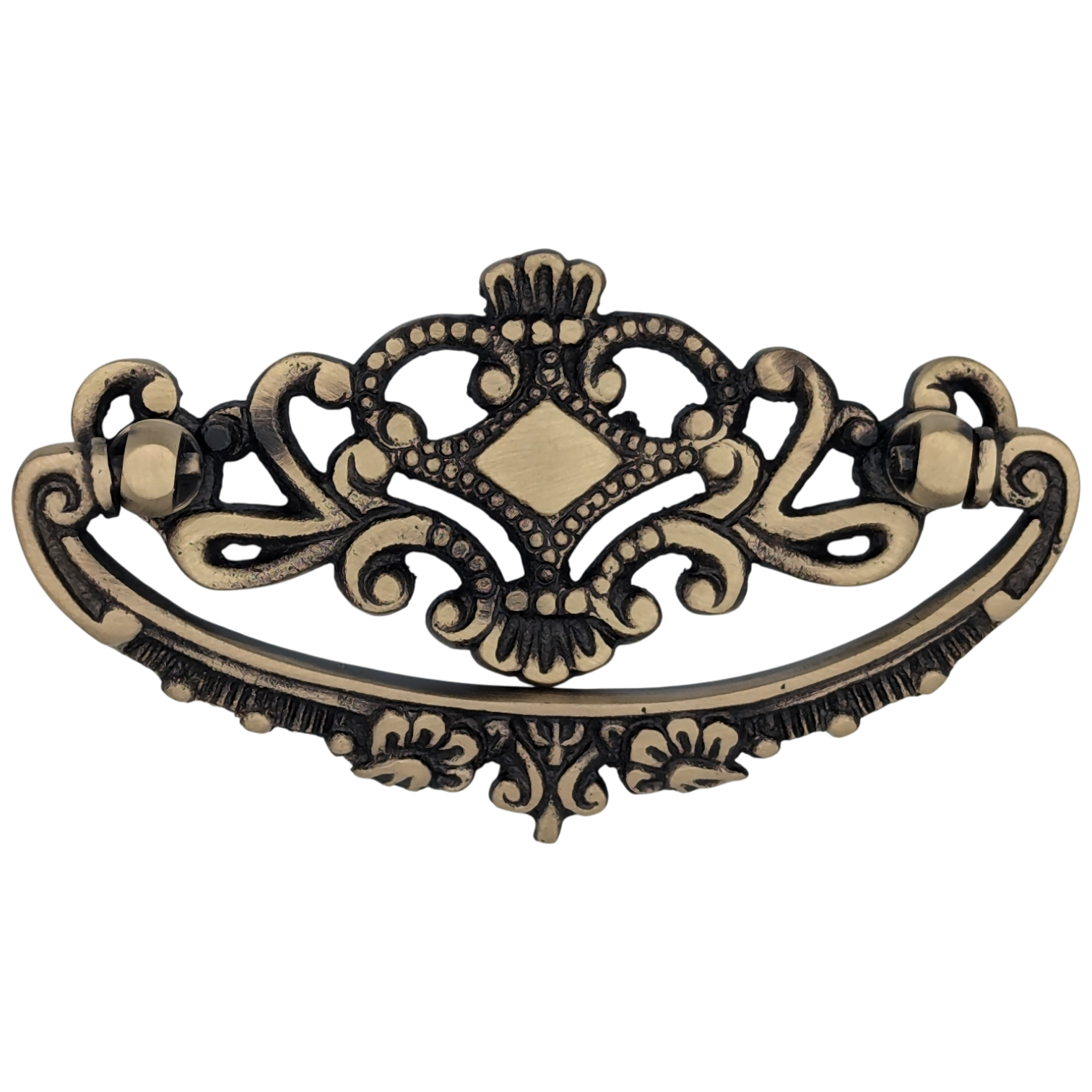 Measures 4 1/8 inches long and 2 1/4 inches tall. Center to center mounting distance is 3 inches (3.00 c-c). Highly ornate and hand finished detailing.