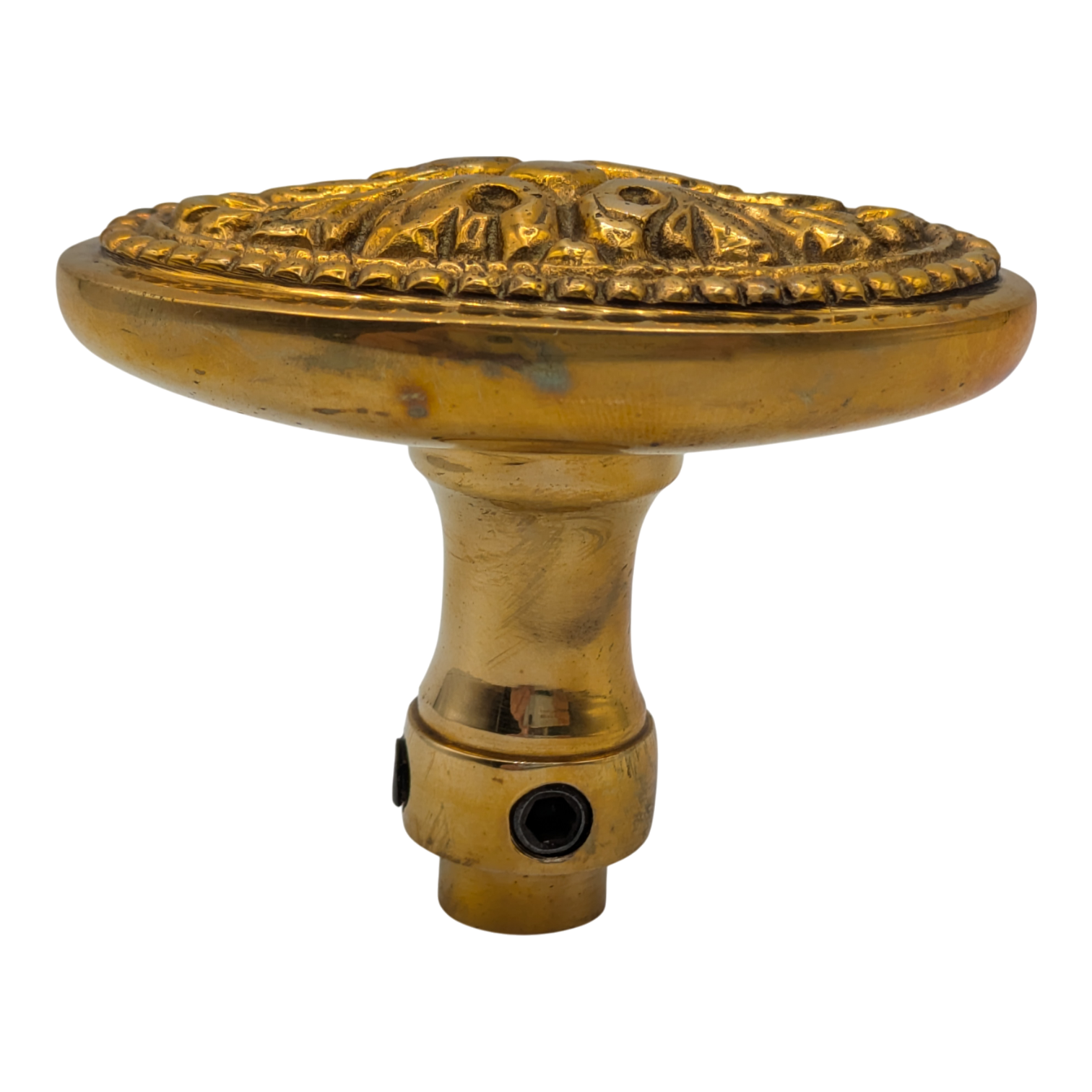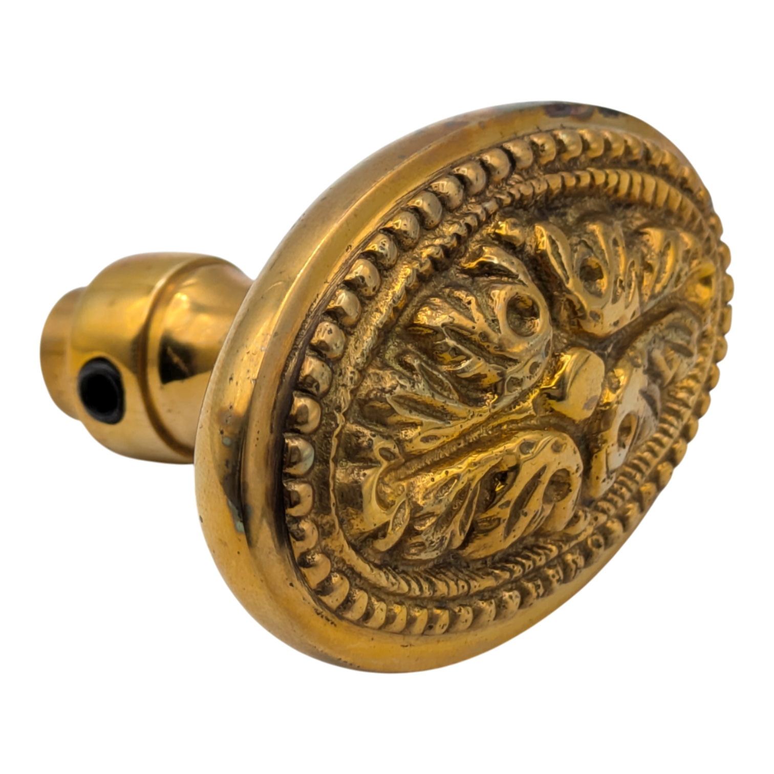This intricately cast oval knob, featured in the P & F Corbin Catalog of 1923, a prominent American manufacturer of architectural hardware and locks during the late 19th and early 20th centuries, stands out particularly in Antique Brass and Black Bronze finishes, adding a dramatic flair to any setting.