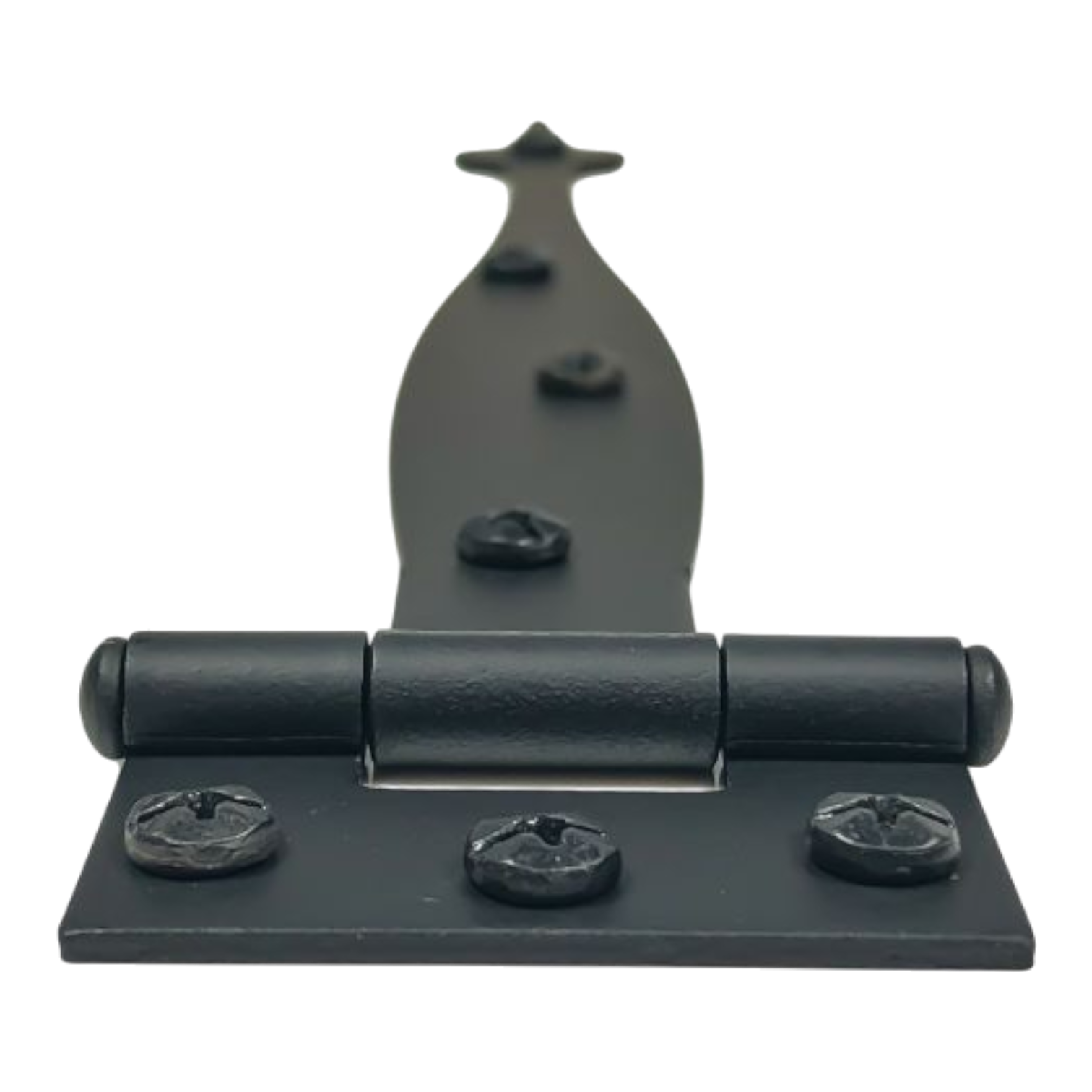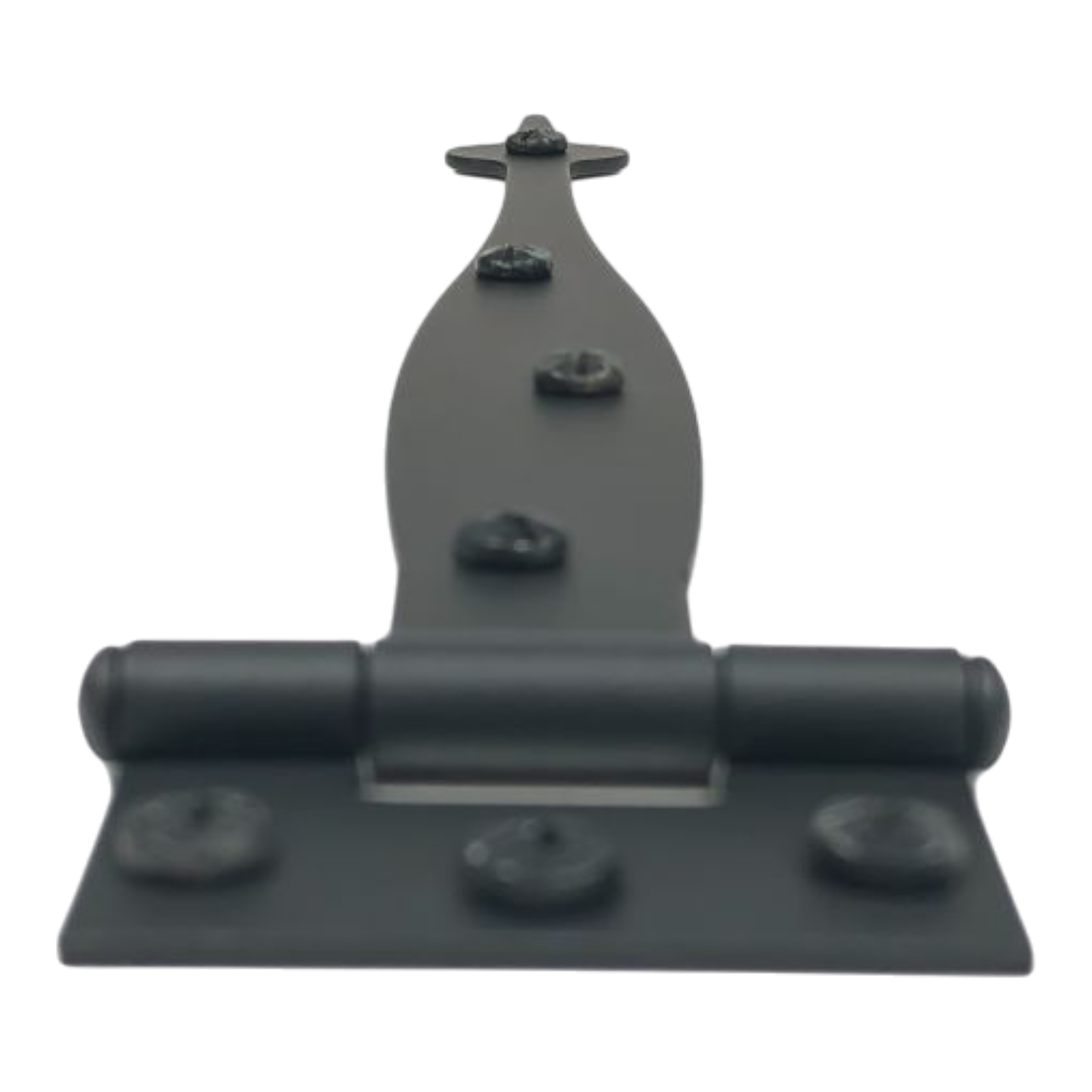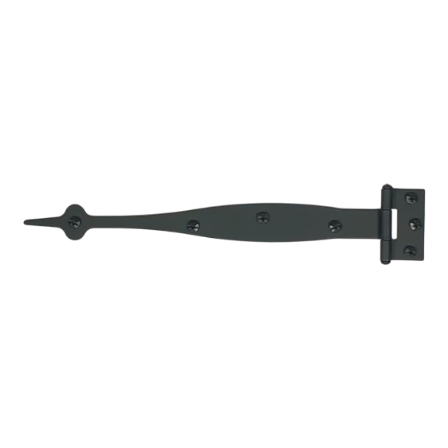 Solid cast iron spear strap hinge. Measures 9 inches long (228 mm) from the center of the hinge to the tip by 1 3/4 inches wide (44 mm) at the widest point. Comes complete with mounting hardware. The average lead time for this pair is approximately 3 to 5 business days.