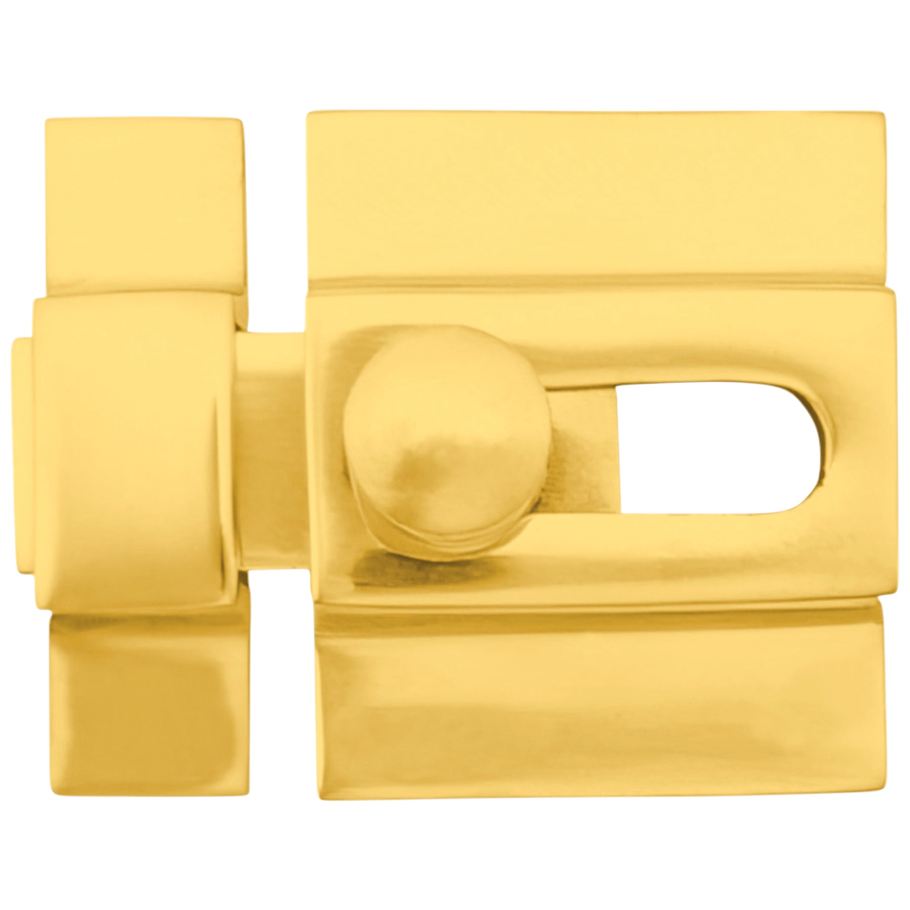 2 1/4 Inch Solid Brass Cabinet Latch With Round Turn Piece - Measures 2 1/4 inches by 1 1/2 inches overall. The base measures 1 5/8 inches by 2 inches tall. The catch measures approximately 5/8 inch by 2 inches tall. This product comes in a polished brass finish. Works with both left hand and right hand doors and this comes complete with the mounting hardware. The slide latch tongue protrudes 1/2 of an inch.
