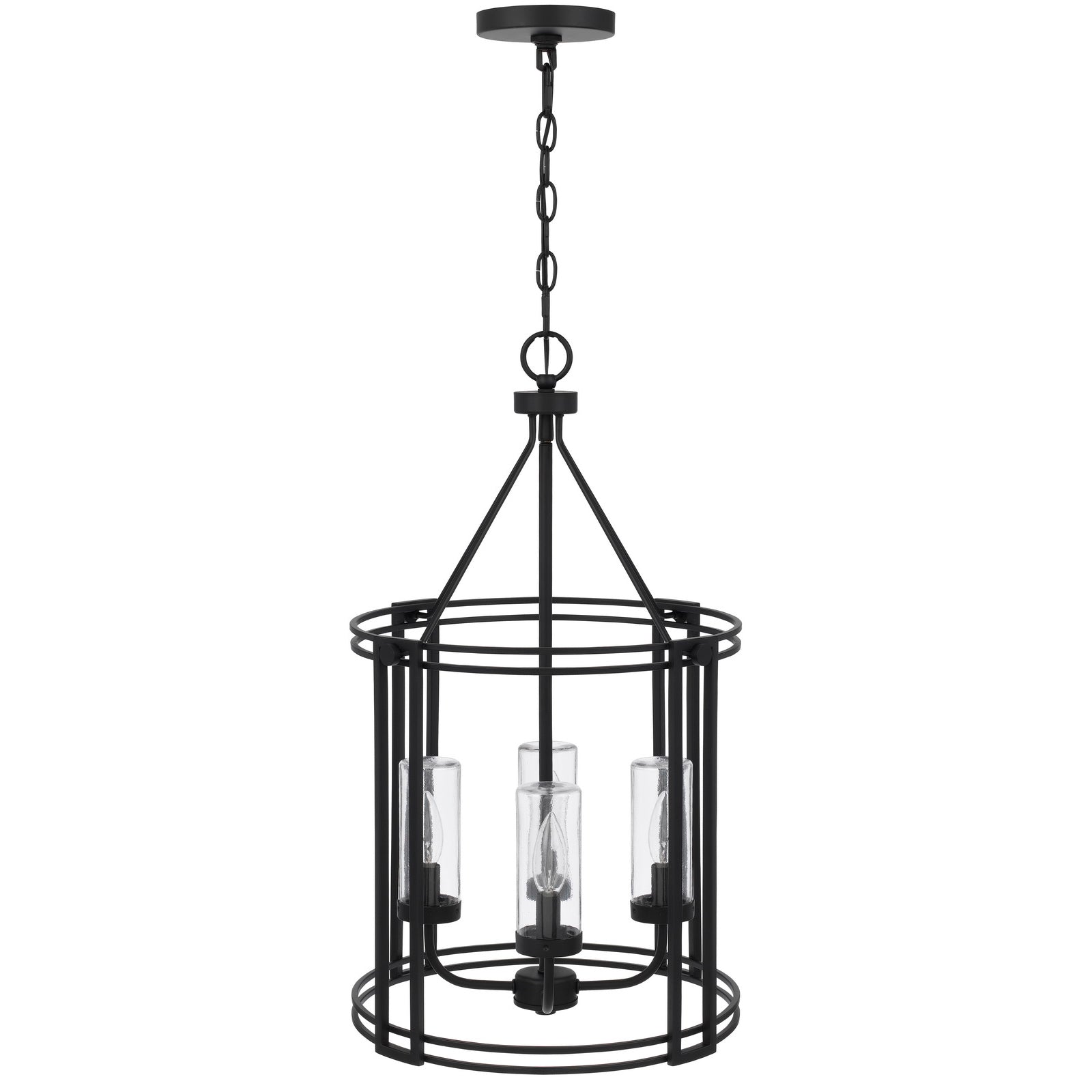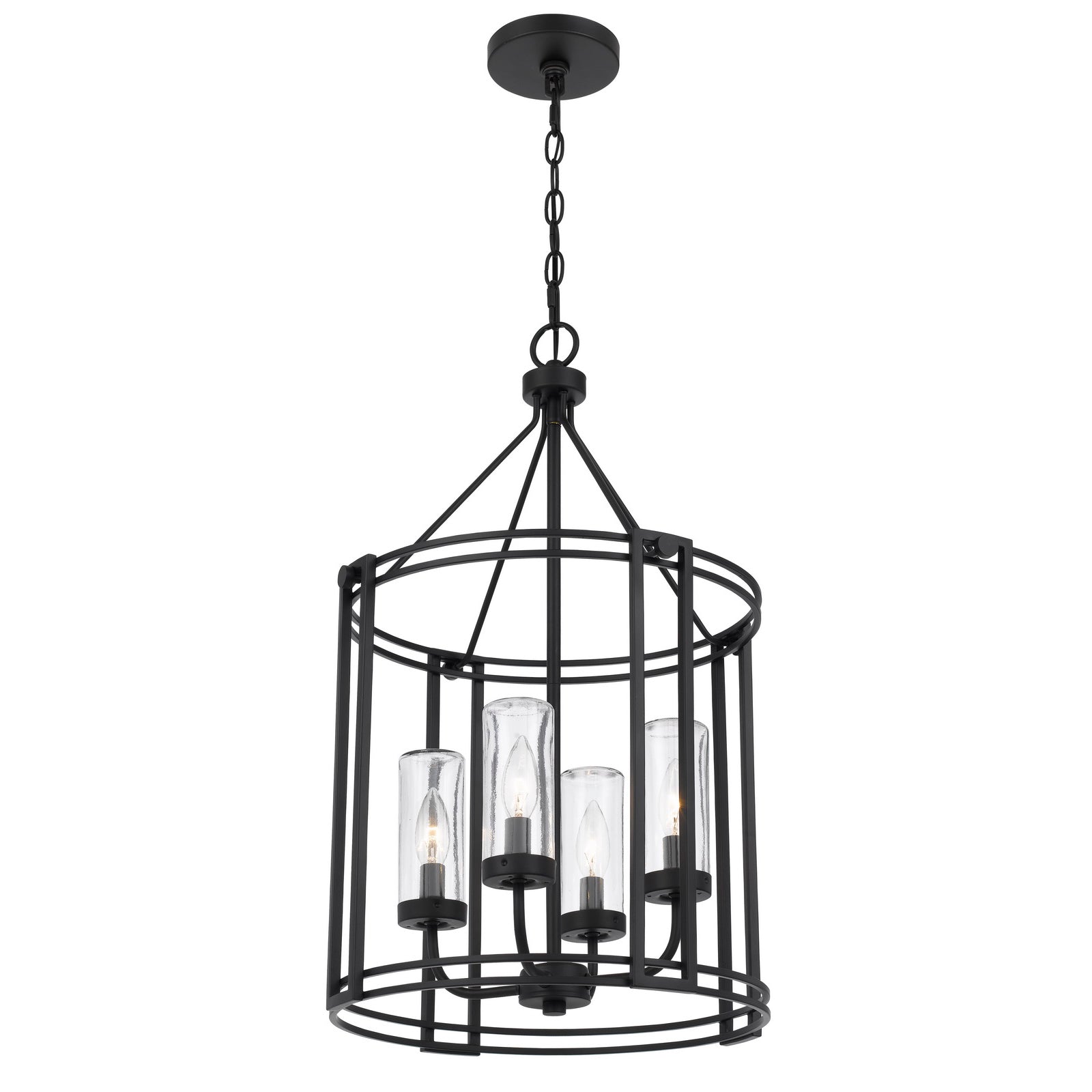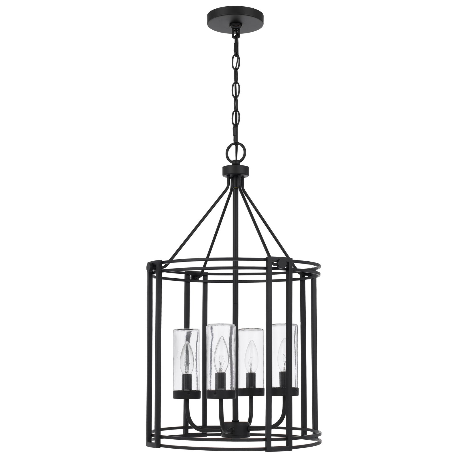 The Luton Cage Metal Chandelier, product No. FX-3777-4, is a striking lighting fixture designed to elevate your decor with its durable iron construction and elegant matte satin finish. This chandelier features a distinctive circular cage design adorned with clear cylinder glass shades, providing a stylish and contemporary look. It supports four E12 base bulbs with a maximum wattage of 60W each (not included) and includes six feet of chain for adjustable hanging. Hardwired for a clean appearance, the chandelier ships in one carton and requires minor assembly. With dimensions of 18.30 inches in length, 15.50 inches in width, and 16.80 inches in height, it is perfect for various interiors. Covered by a one-year warranty, this fixture assures quality and craftsmanship.
