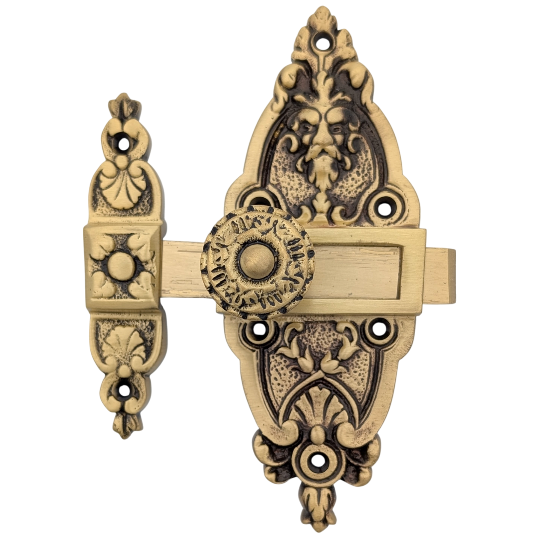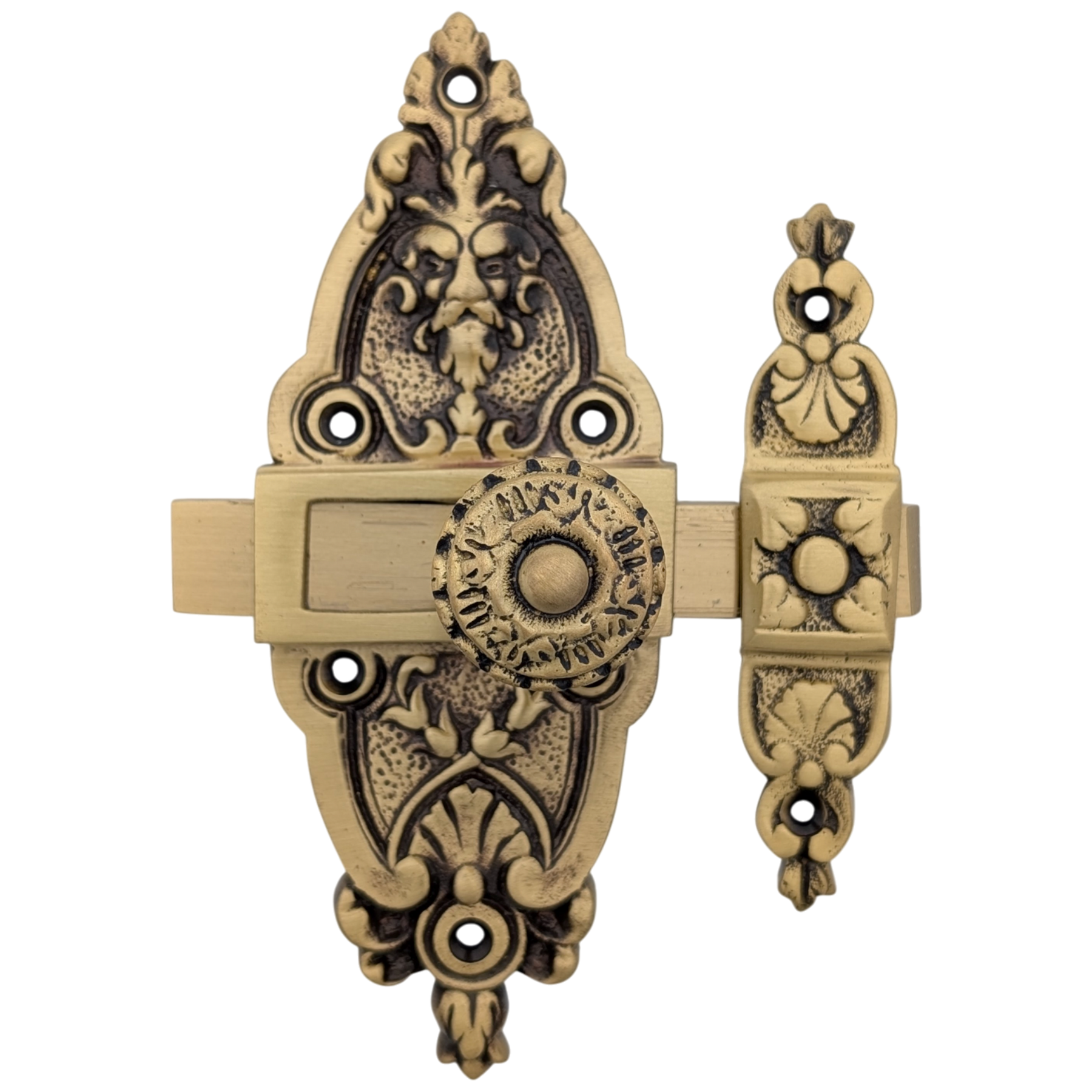 Comes complete with two pieces and mounting screws. Long piece measures 2 inch long and 5 1/2 inch tall (does not include slide bolt measurement) with a projection of 1 1/2 inch. Smaller piece measures 3/4 inch wide and 3 1/2 inch tall. Can be mounted with catch on left or right.