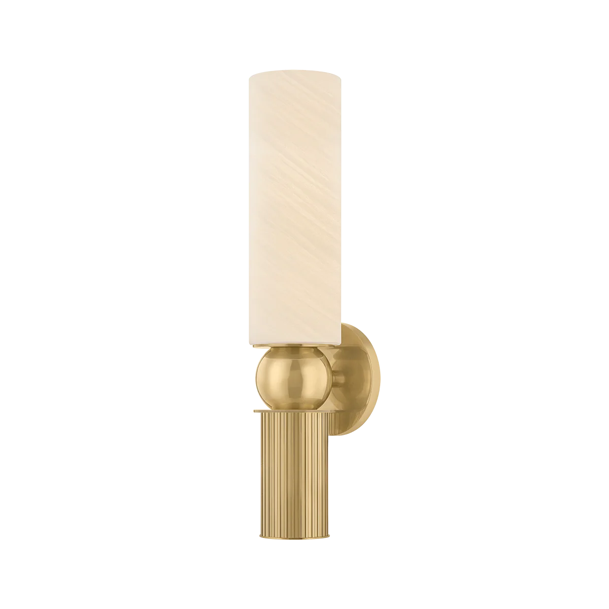 Inspired by classical architecture, the Ronda sconce recalls a Greek column with soft curves and uniform fluting. A matte cloud glass shade diffuses ambient light above, while a hidden light source within the metal cylinder casts a focused glow below. To complement the antique aesthetic, Ronda is finished in Vintage Brass.