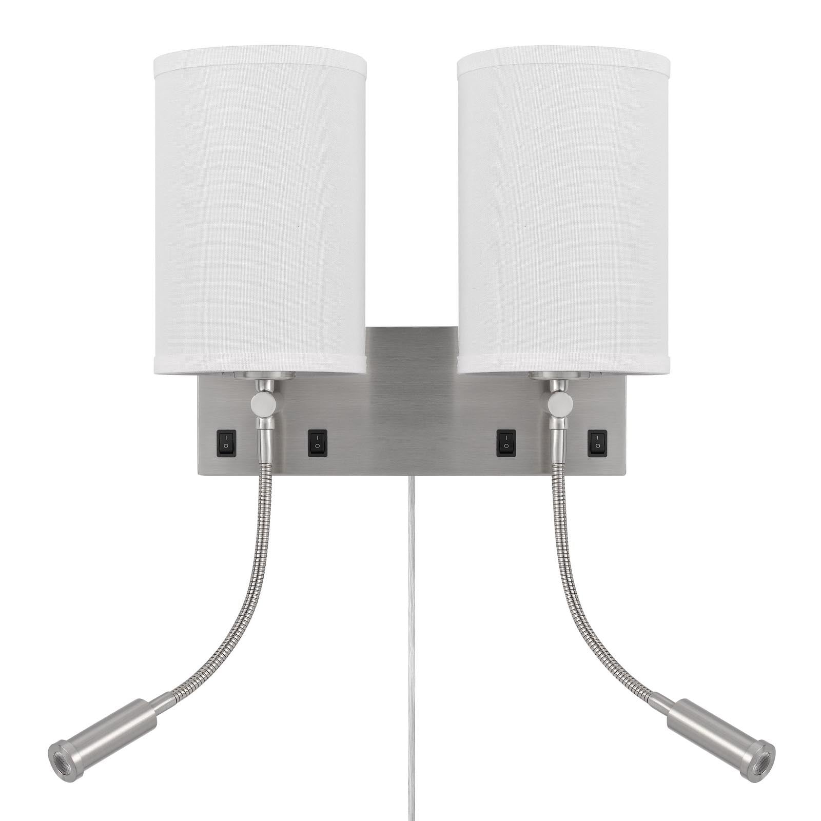 The Lakewood Wall Lamp, model LA-8045W2L-1, is a modern lighting solution designed for both functionality and style. This sophisticated fixture features two 60W bulbs and two integrated 1W LED reading lamps, providing ample illumination. The durable metal construction ensures longevity, while the flexible gooseneck design allows for directed lighting. With a rocker switch conveniently located on the base, this lamp is easy to operate. It also includes a hardback linen shade that softens the light, complemented by a brushed steel metal finish for a contemporary touch. Its dimensions are L: 6.20, W: 15.30, H: 11.50, and it requires assembly. The product comes with a one-year warranty against defects, making it a reliable addition to your home.