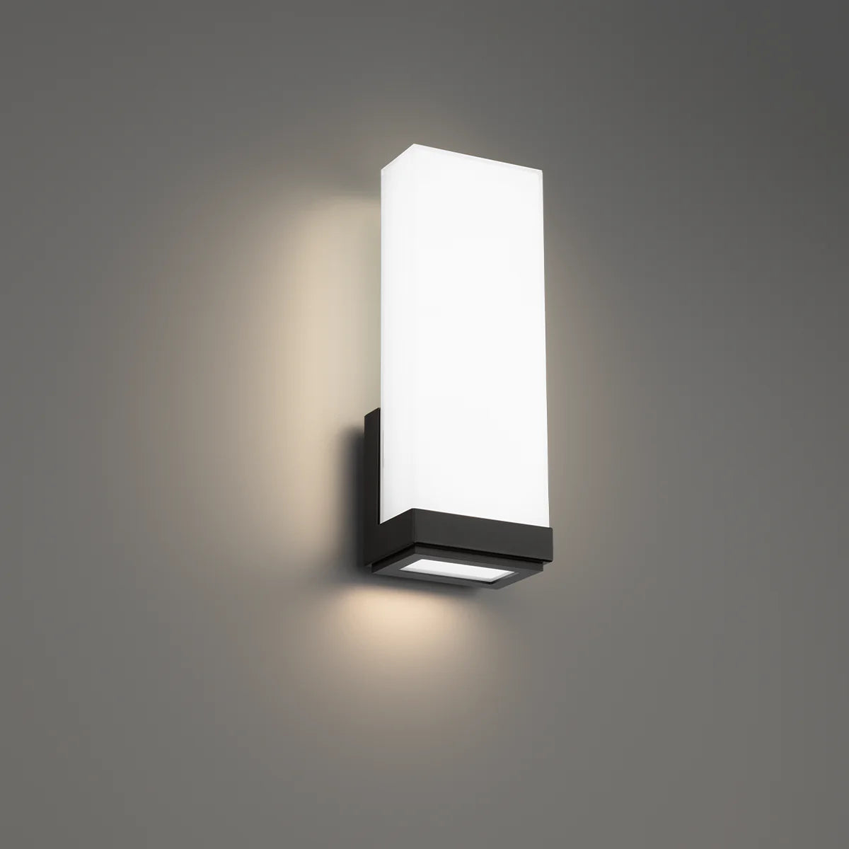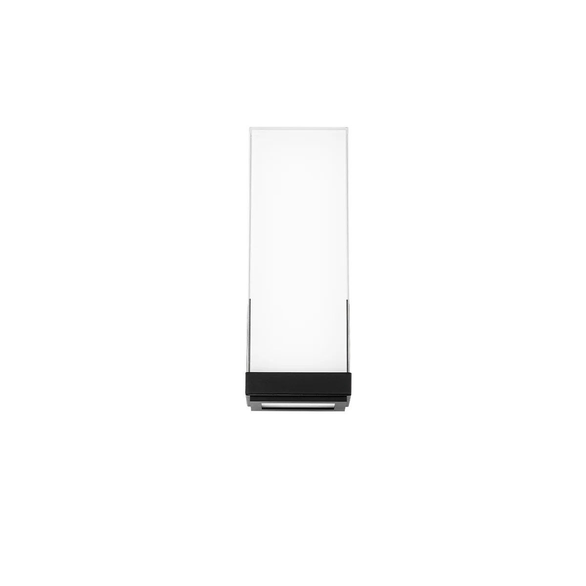 Coltrane 14in LED Wall Sconce 2700K in Black. A geometric monolith block of luminosity. Coltrane is a 14-inch indoor wall sconce with a clean silk screened, mitered cut tempered glass. When illuminated Coltrane is a real simplistic and eye catching design. Choose an aged brass or black finish to complete your design. Energy efficient integrated LED's provide a long-lasting maintenance-free bright and even illumination. This ADA compliant, low profile design makes the Coltrane collection a great choice in upscale hospitality or residential homes. NEW: Tri-CCT technology features a switch inside the canopy that is accessible during installation and allows you to toggle color temperatures between 2700K Warm - 3000K Warm White - 3500 White to find and set the perfect color temperature for your space. This fixture is factory pre-set to a default 3000K setting for consistency and can be modified in the field during installation. White ceramic silk-screened miter cut glass adorns die cast hardware and conceals energy efficient integrated LED's providing a long-lasting maintenance-free bright and even illumination. Coltrane provides an ambient outward and downward illumination. NEW Tri-CCT technology features a switch inside the canopy that is accessible during installation and allows you to toggle color temperatures between 2700K Warm - 3000K Warm White - 3500 White to find and set the perfect color temperature for your space. This fixture is factory pre-set to a default 3000K setting for consistency and can be modified in the field during installation. Universal Voltage driver (120V-220V-277V) is concealed in the canopy. Smooth and continuous dimming with an electronic low voltage (ELV) or TRIAC dimmer. High Powered Replaceable LED with CRI: 90, Rated Hours: 60,000, Color Temp: 2700K-3000K-3500K Adjustable Standards: ETL & cETL UL 1598 listed for Damp Locations. CEC Title 24 Compliant, and ADA Compliant.