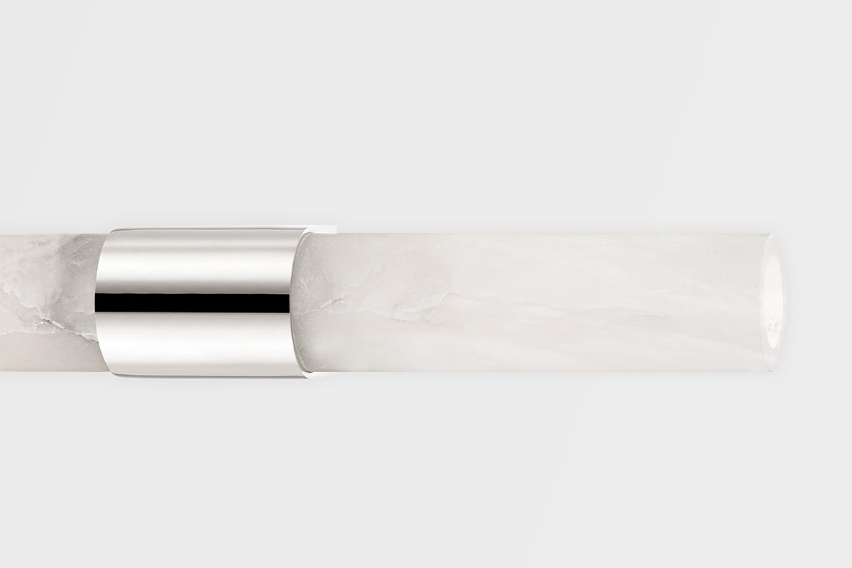 The Ellington Wall Sconce by Hudson Valley Lighting combines modern elegance with functionality. This stunning fixture measures 3.25 inches in diameter and stands 24 inches tall, with a sleek 3.75-inch extension. It features a beautiful white alabaster shade that softens the light, accommodating two E26 medium base bulbs with a maximum wattage of 8W each (bulbs not included). The fixture is available in an Aged Brass (AGB) or Polished Nickel (PN) finish, adding a touch of sophistication to any space. Designed for versatility, it is UL Damp rated, making it suitable for areas with moderate moisture.