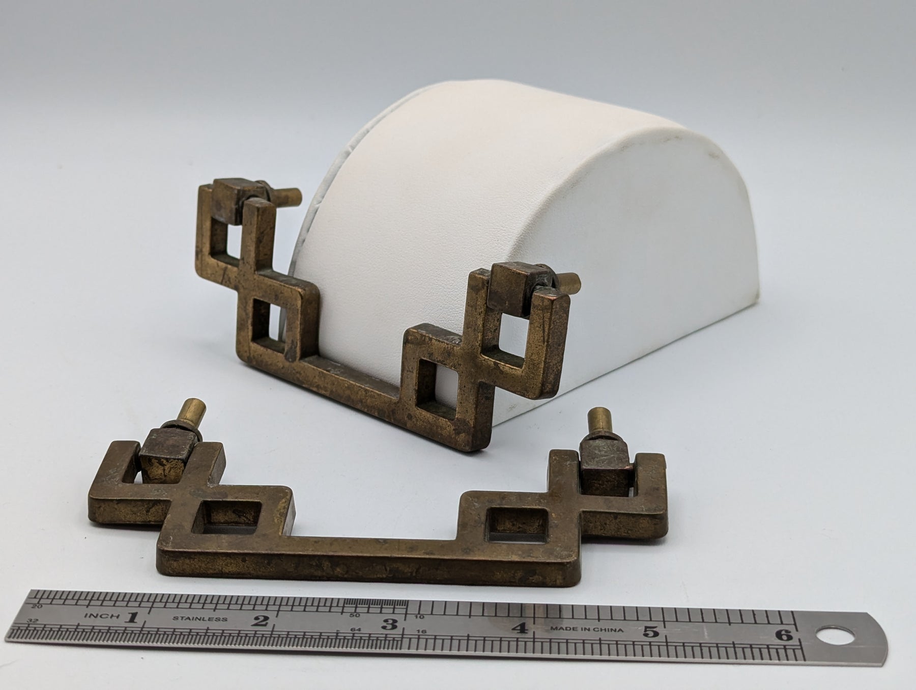 A set of brass bail pulls designed for a 1950s Bassett Asian Chinoiserie dresser. It measures approximately 5 inches in height and 2 1/2 inches in width, with a 4-inch center-to-center measurement. These pulls feature a geometric design inspired by Chinoiserie aesthetics, showcasing the craftsmanship of the era.