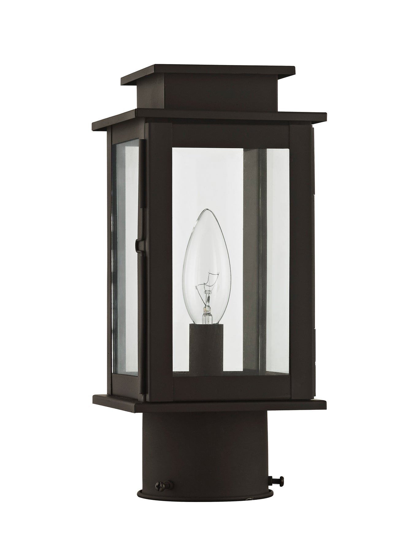 The 20201-07 Princeton Post Top Lantern is a stunning outdoor fixture that beautifully combines traditional design with modern durability. Crafted from hand-crafted solid brass, this lantern features a rich bronze finish and clear glass for a timeless look. Measuring 4.75 inches in length and width, and standing 10.5 inches tall, it accommodates one candelabra base bulb with a maximum wattage of 60. Perfect for damp and wet locations, its elegant design is ideal for enhancing the charm of outdoor spaces.