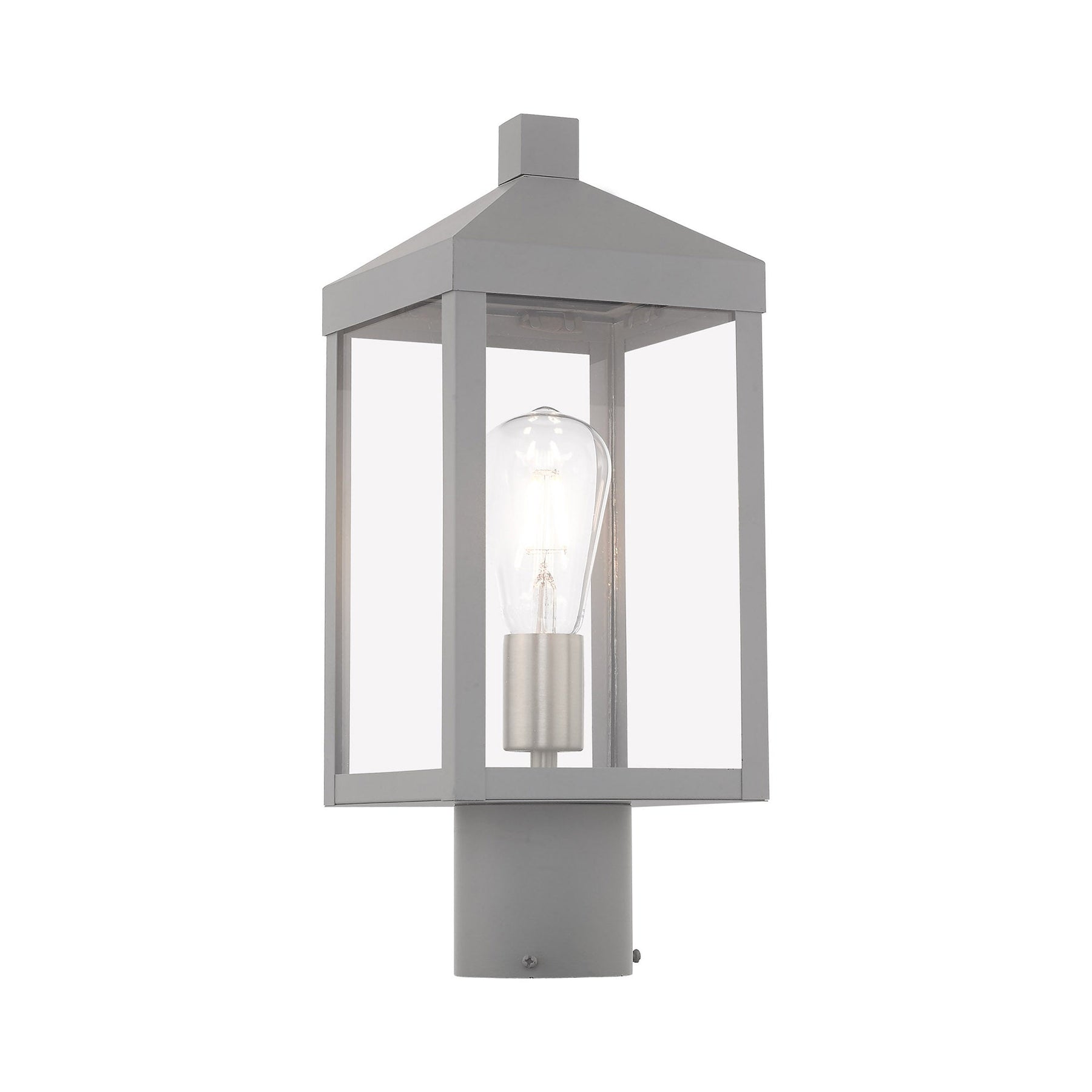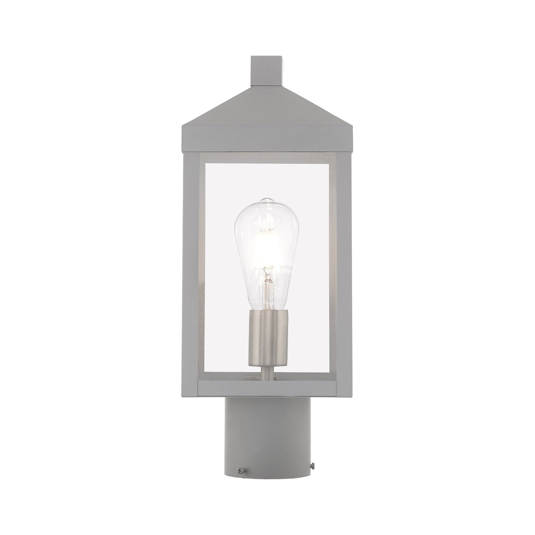 The 20590-80 Nyack Outdoor Post Top Lantern is a striking lighting fixture that combines a contemporary design with functionality. This outdoor lantern features a solid brass construction in a sophisticated Nordic gray finish and is complemented by clear glass panels. Measuring 6.25 inches in length and width, and standing at 15.25 inches tall, it accommodates one medium base bulb with a maximum wattage of 100W (bulb not included). Designed to withstand the elements, this lantern is suitable for both damp and wet locations, making it an ideal choice for enhancing outdoor spaces with a blend of style and durability.