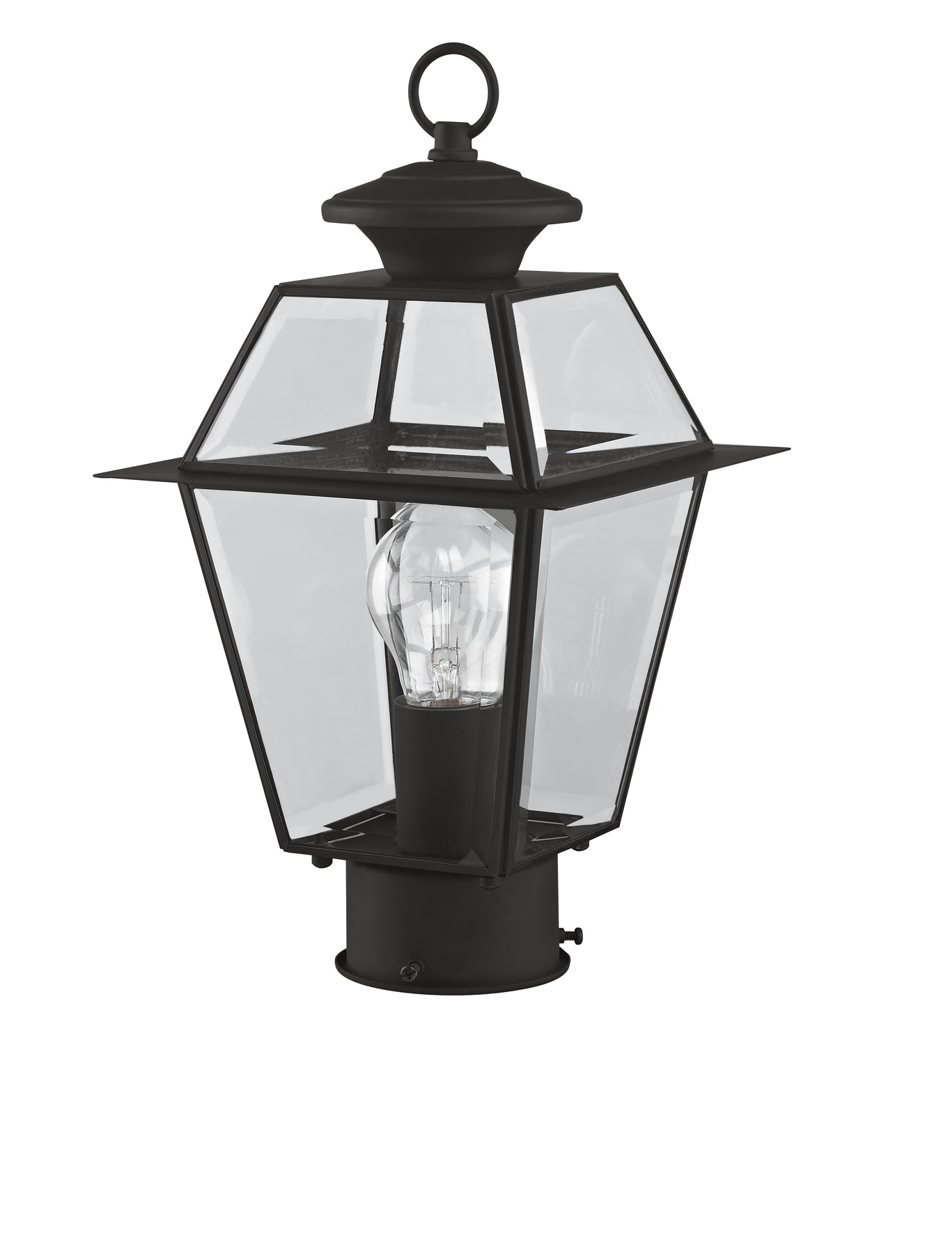 The Westover Outdoor Post Head, item number 2182-04, is a striking addition to any outdoor space, inspired by the timeless elegance of gas-burning lamps. Crafted from hand-made solid brass, this fixture showcases a beautiful black finish and features clear beveled glass for an authentic vintage look. Measuring 7.5 inches in both length and width, and standing at 14 inches tall, it accommodates one medium base bulb with a maximum wattage of 100W. Designed to withstand the elements, this piece is suitable for both damp and wet locations, making it an ideal choice for enhancing your yard or patio.