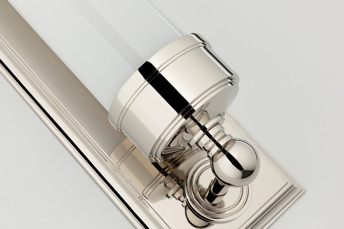 The Everett Wall Sconce by Hudson Valley Lighting is a stunning addition to any modern space, featuring a sleek design with an opal glossy glass shade that diffuses light beautifully. This fixture measures 4.75 inches in diameter and stands 14.25 inches tall, with a 4.50-inch extension and a top-to-center height of 7.00 inches. It is equipped with one E26 medium base socket, accommodating a recommended A19 bulb with a maximum wattage of 100W. The sconce is available in multiple finish options including Aged Brass, Old Bronze, Polished Nickel, and Satin Nickel, making it versatile enough to complement various decor styles. Additionally, it is UL Damp rated, ensuring its suitability for humid environments.