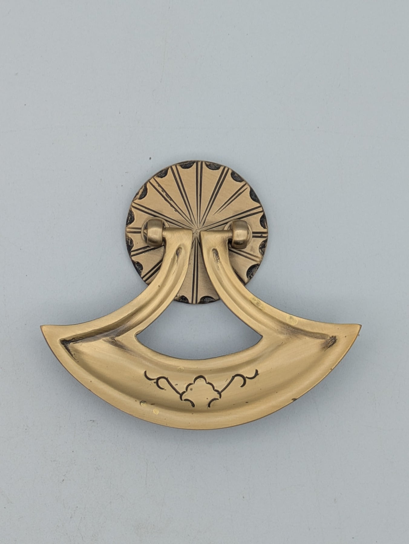 This cabinet pull features an elegant, curved design with two sweeping arms, reminiscent of a classical or Art Deco aesthetic. The detailed sunburst motif on the backplate adds depth and a sense of symmetry to the piece. Crafted from solid brass, it brings a touch of refined vintage charm to any cabinetry.