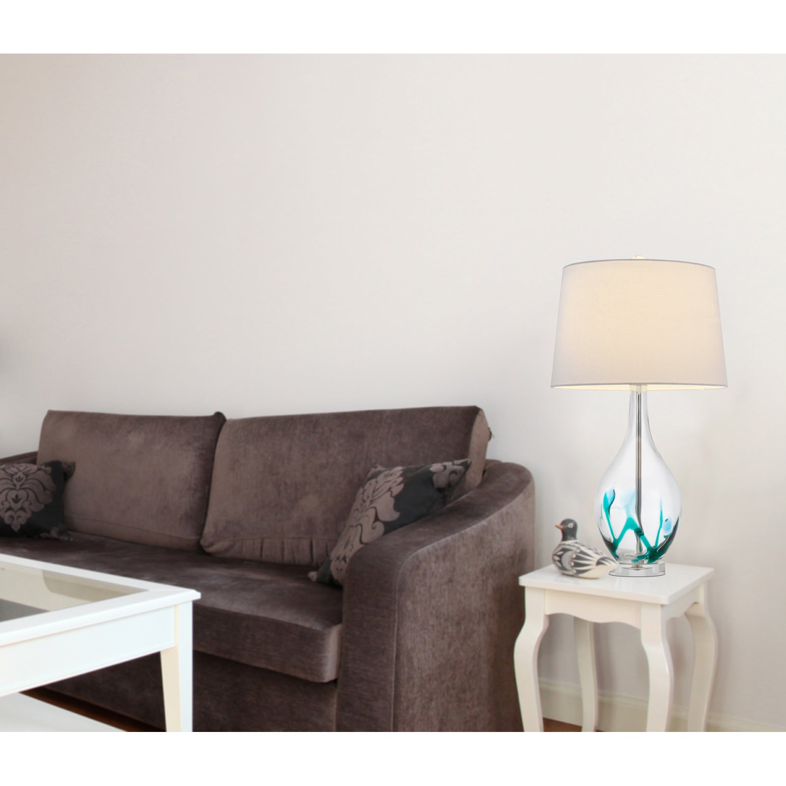 The BO-2996TB Harlan Glass Table Lamp is a stunning addition to any room, featuring a unique bowling pin shape and a vibrant floral pattern on its hand-blown art glass body. With a clear turquoise finish and a crystal base, this lamp provides an elegant touch to your decor. It operates with a 150W wattage and utilizes a 3-way switch type for adjustable lighting. The lamp is topped with a stylish hardback taper drum fabric shade, and assembly is not required. With dimensions of 16.00\