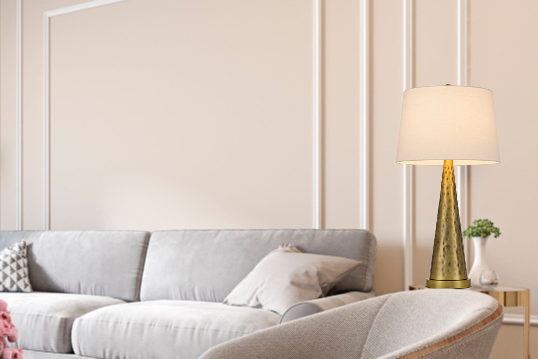 The Cusago Metal Table Lamp, Product No. BO-3033TB, combines modern design with durability, featuring a striking hammered metal finish in an antique brass color. This lamp is designed for stability with its weighted base and includes a durable hardback linen shade. It operates with a convenient 100W on/off switch and accommodates one E26 bulb (not included). With dimensions of 15 inches in both length and width, and a height of 22 inches, this lamp is the perfect addition to illuminate any space. It offers minor assembly and comes with a one-year warranty, ensuring quality and peace of mind.