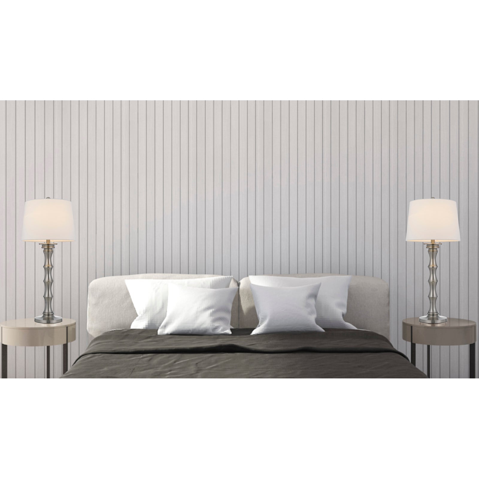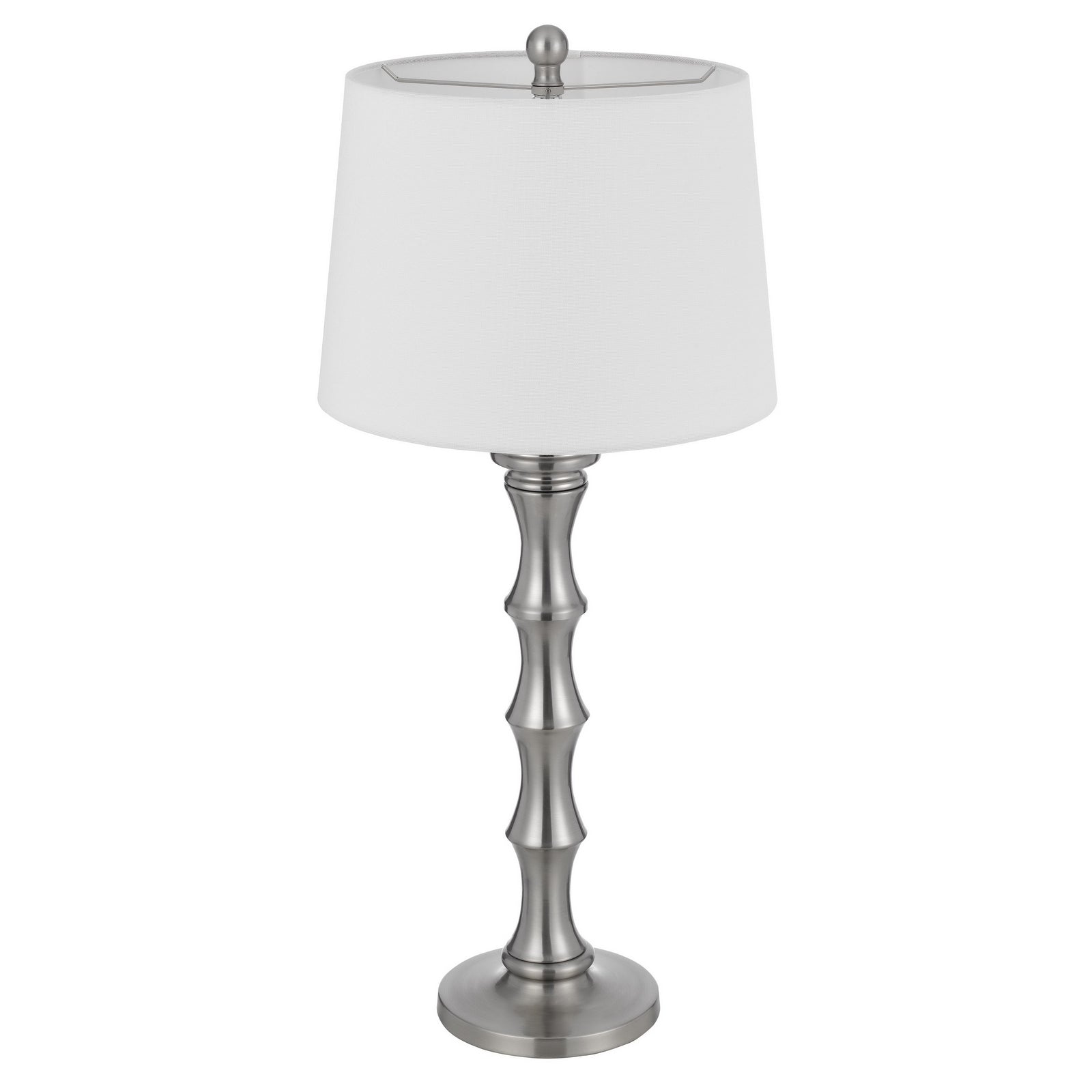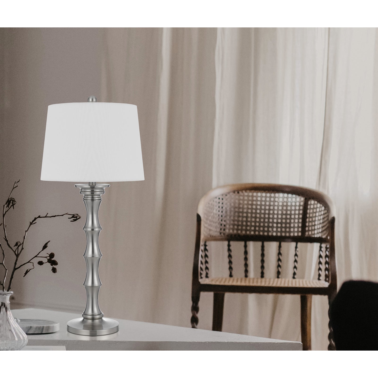 The Rockland 150W 3-way metal table lamp set (Product No. BO-3066TB-2-BS) is a fantastic addition to any decor, bringing a tropical touch with its unique bamboo stick shape. Constructed from durable metal, these lamps are sold as a pair, perfect for matching nightstands or end tables. Each lamp includes a hardback linen shade and requires little to no assembly, ensuring a hassle-free setup. The lamp features an E26 bulb base with a maximum wattage of 150W and operates on a convenient 3-way switch. Delivered in a single carton, this stylish lighting solution is backed by a one-year warranty, emphasizing its quality craftsmanship.