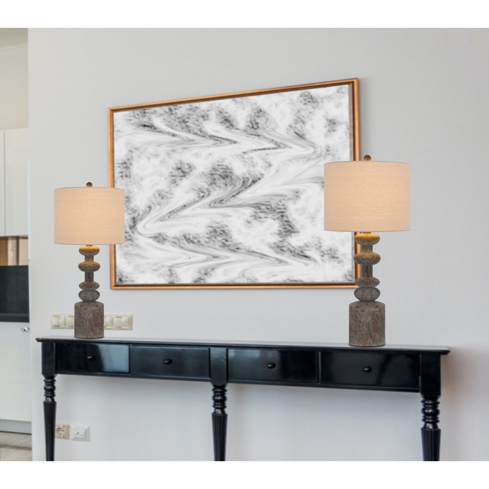 The Blackfoot Resin Table Lamp, product number BO-3080TB-2, is a striking addition to any home, offering a perfect blend of durability and style. This pair of lamps features a robust resin construction with a stylish faux stone finish, ensuring an earthy aesthetic. Each lamp is equipped with a weighted base for enhanced stability, and they are sold as a set for a cohesive look. With a 3-way switch and a wattage of 150W, these lamps accommodate E26 bulb bases. The included hardback fabric shades diffuse light beautifully, making them suitable for various settings. Measuring 15.00 inches in length and width, and 25.50 inches in height, they ship in one carton and require assembly. Cal lighting offers a one-year warranty on this product, ensuring its quality and craftsmanship.