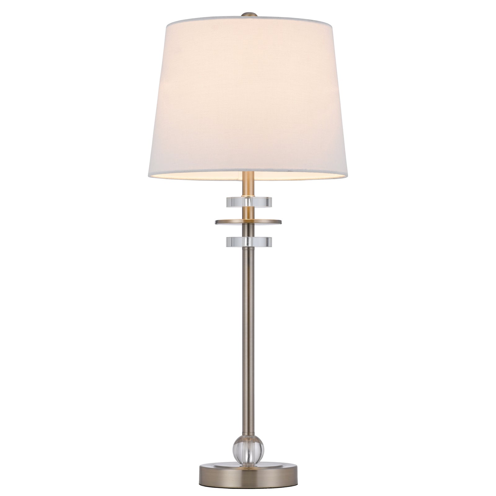 The BO-3094BF-2 Sitka Buffet Lamp pair showcases a stunning blend of durable metal and crystal construction with a contemporary brushed steel finish. Each lamp features a hardback taper drum fabric shade, adding elegance to any console table or living space. With a maximum wattage of 60W and equipped with E26 bulb bases, these lamps offer both functionality and style. Measuring 14.80 inches in length, 13.80 inches in width, and 17.80 inches in height when packaged, they are conveniently shipped in one carton. Assembly is required, and the product is backed by a one-year warranty against defects.