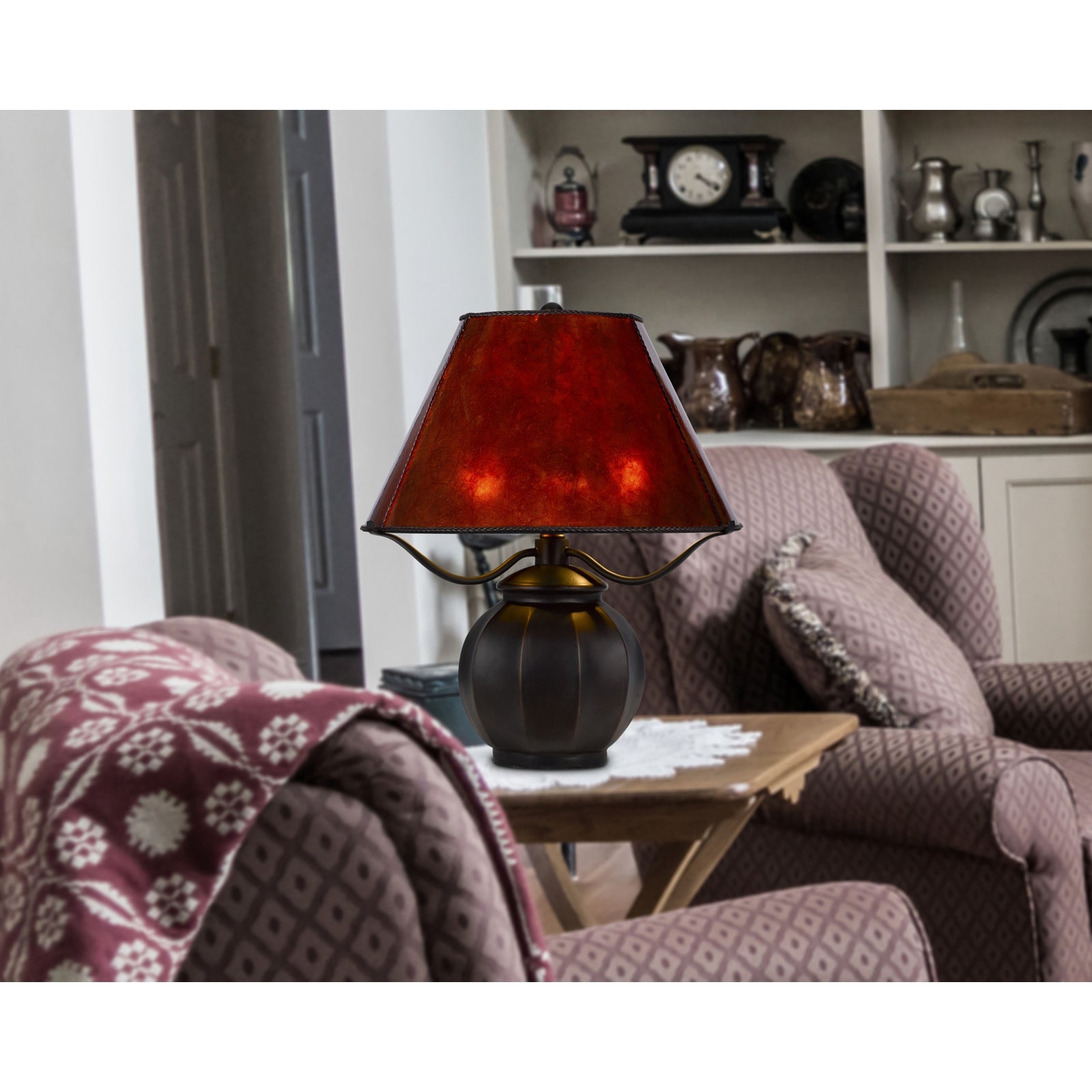 The Indio Table Lamp, Product No. BO-3102TB, combines a stylish dark bronze metal and resin design with durability and functionality. Featuring a natural compressed mica shade, this lamp creates a warm and inviting atmosphere in any space. It utilizes two 60W bulbs (not included) and operates with a convenient pull chain switch. Additionally, the lamp has a round faceted body that adds a unique touch to your decor. With dimensions of 19.30 x 19.30 x 18.00 inches, it ships in one carton and requires assembly. Enjoy peace of mind with a one-year warranty, free from defects in material and workmanship.