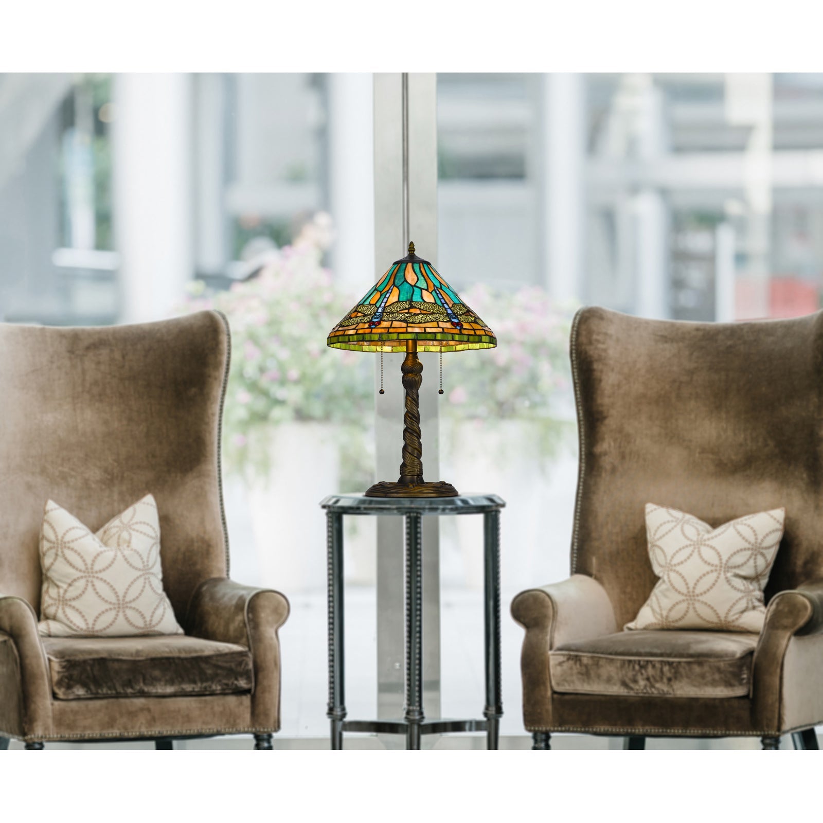 The BO-3108TB Tiffany Table Lamp is a stunning blend of artistic design and functionality, featuring a vibrant stained glass dragonfly shade that adds a pop of color to any room. This lamp has a robust construction made from durable resin and metal, ensuring long-lasting use. It operates with two pull chain switches and requires two E26 bulbs with a maximum wattage of 60W each. The lamp's weighted base provides added stability, making it a safe addition to your decor. Measuring 19.80 inches in length, 11.30 inches in width, and 24.00 inches in height, it ships conveniently in one carton and comes with a one-year warranty against defects.