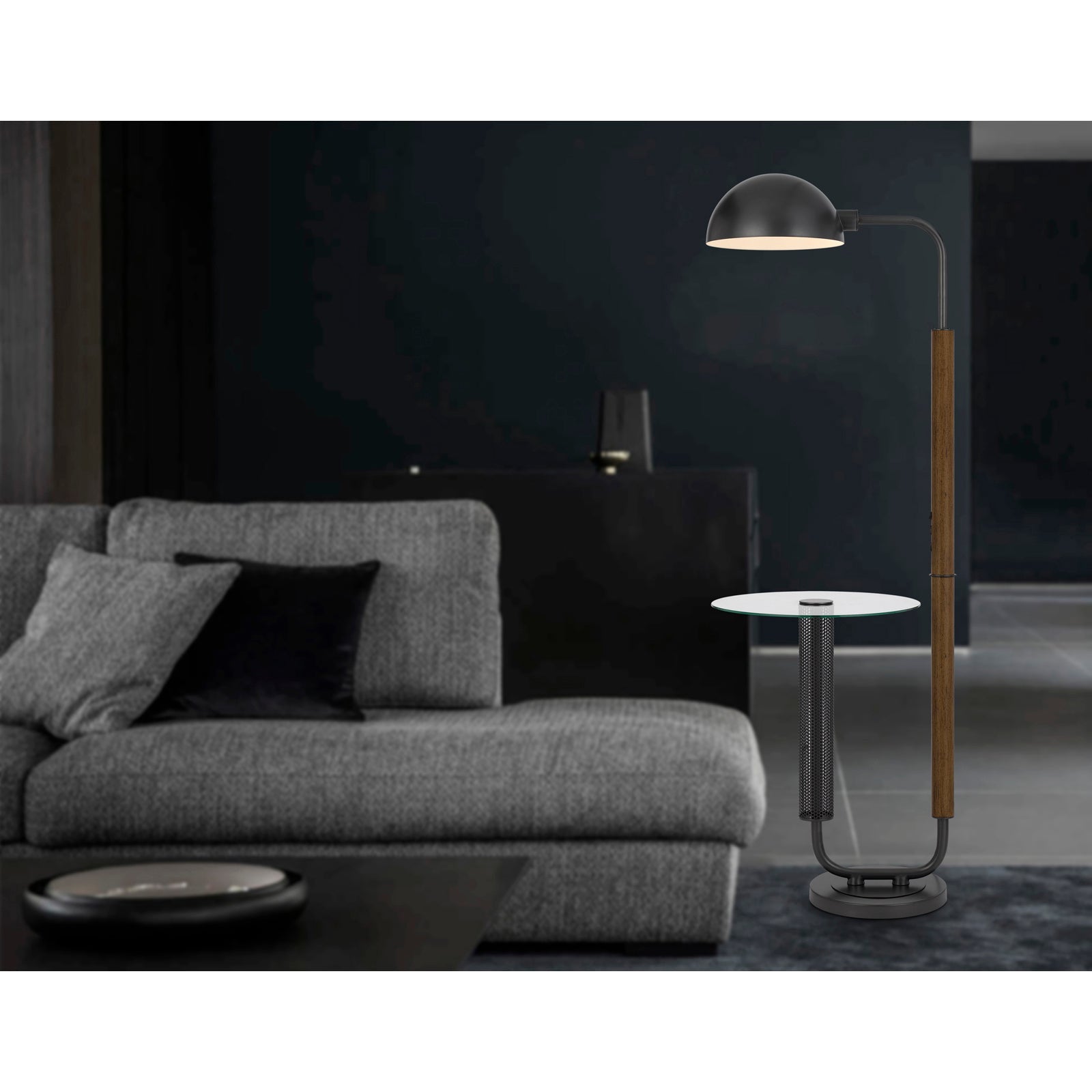 The 100W Keyser Metal Floor Lamp is a perfect addition to any seating area or entertainment room, featuring a sophisticated design with a faux wood pole and a functional glass tray table. This lamp includes a durable black metal dome style shade and is equipped with convenient charging ports, offering one USB and one USB-C outlet. With a weighted base for added stability, it is crafted from high-quality glass and metal to ensure longevity. The lamp requires one E26 bulb (not included) and ships in one carton. Assembly is required, and it comes with a one-year warranty against defects in material and workmanship.