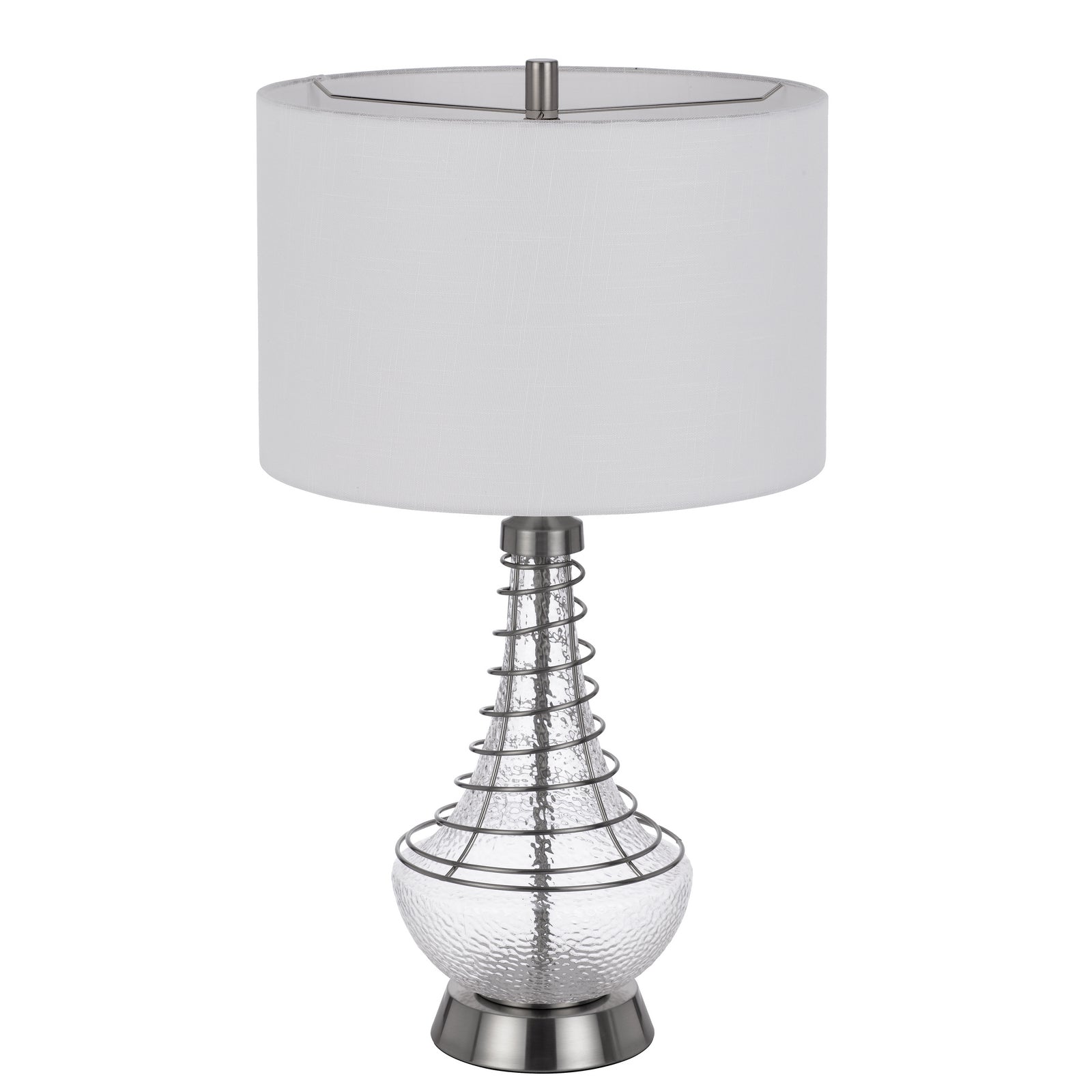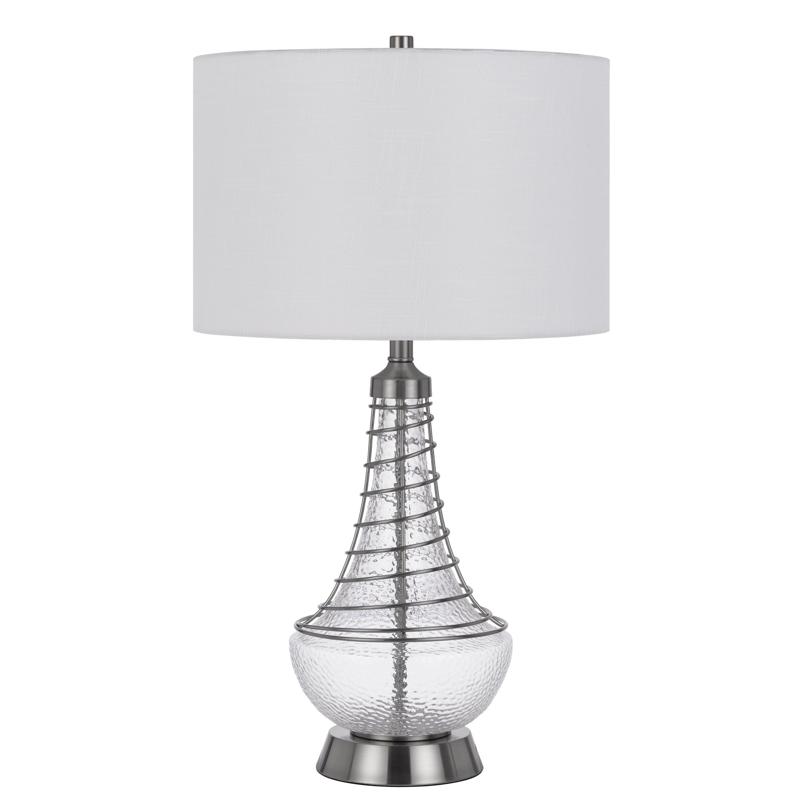 The BO-3130TB Baraboo Glass Table Lamp is a stunning 150W lighting solution featuring a unique wire guard design and a stylish drum fabric shade. Crafted with durable glass construction and accented by a decorative metal wire corkscrew, this lamp combines both elegance and stability with its weighted base. It is equipped with a convenient 3-way switch for versatile lighting options and ships fully assembled in one carton. Measuring 18.10 inches in length and width, and 19.50 inches in height, this lamp is perfect for enhancing any living room or bedroom setting, backed by a one-year warranty against defects.