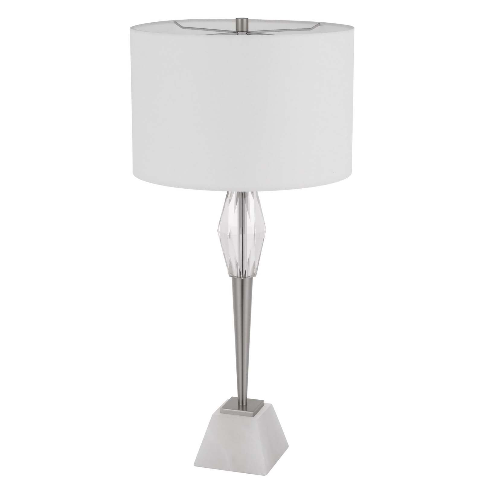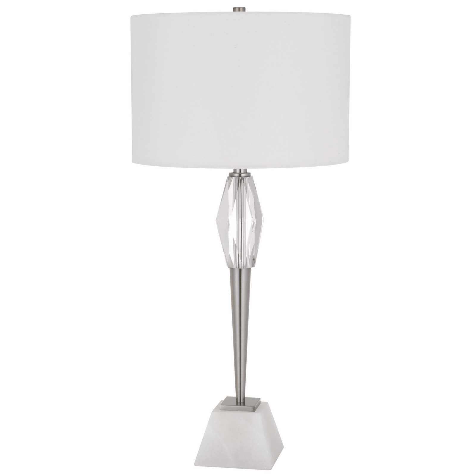 The BO-3155TB 150W 3-way Assen metal table lamp combines elegance with functionality, making it a perfect addition to any living room, office, or bedside setting. Constructed from durable brushed steel, the sleek torch-style body is accented with faceted crystal details. The lamp is supported by a solid marble weighted base for enhanced stability. It features a stylish drum hardback fabric shade, a rotary switch on the socket, and requires minimal assembly, shipping conveniently in one carton. This lamp is designed to accommodate a single E26 base bulb, providing a maximum wattage of 150W for brilliant illumination.