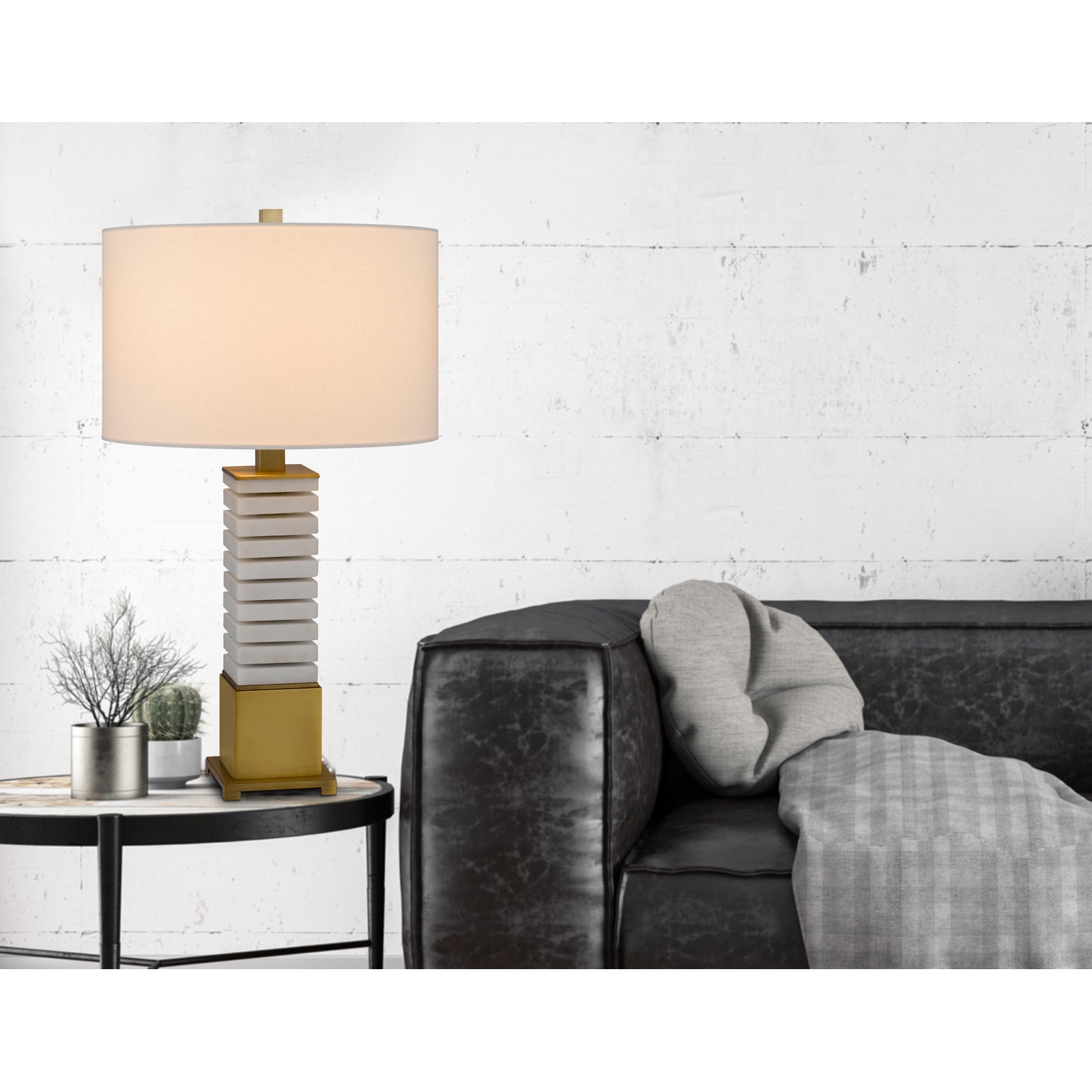 The BO-3158TB Cranbourne table lamp combines style and function, featuring a 150W power capability and a versatile three-way switch for customizable lighting. Its durable metal construction ensures longevity, while the weighted base adds stability. The elegant design is enhanced by stacked marble accents and a hardback drum fabric shade, which softens the light for a warm ambiance. Minimal assembly is required, and it ships in one carton. With a sleek antique brass finish, this lamp is perfect for elevating any contemporary decor.