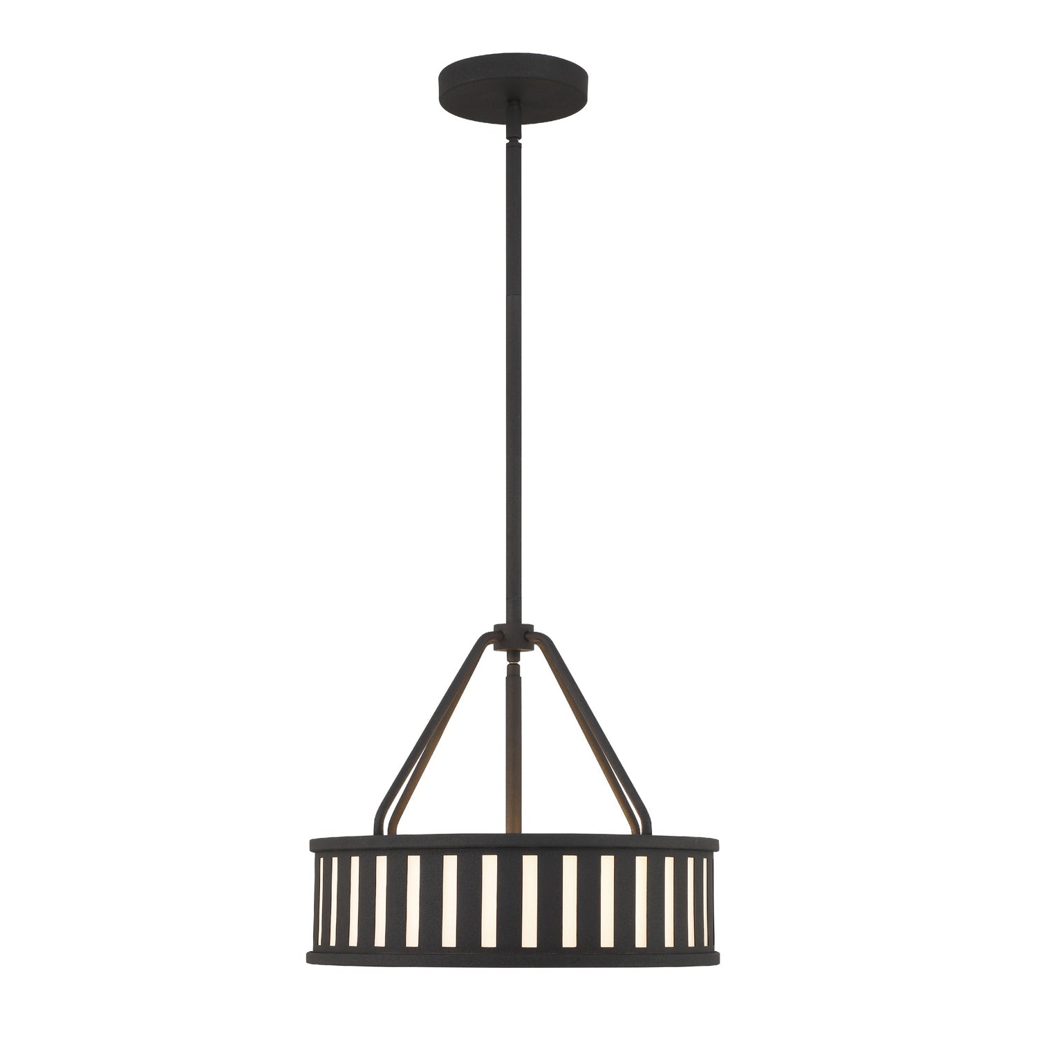 The contemporary Kendal collection makes a statement with its graphic uniform pattern. Its metal frame surrounds white glass in this elegant drum-shaped pendant. The high contrast of Vibrant Gold, Black Forged, or Polished Nickel against white glass is a great way to add a touch of drama to a room.
