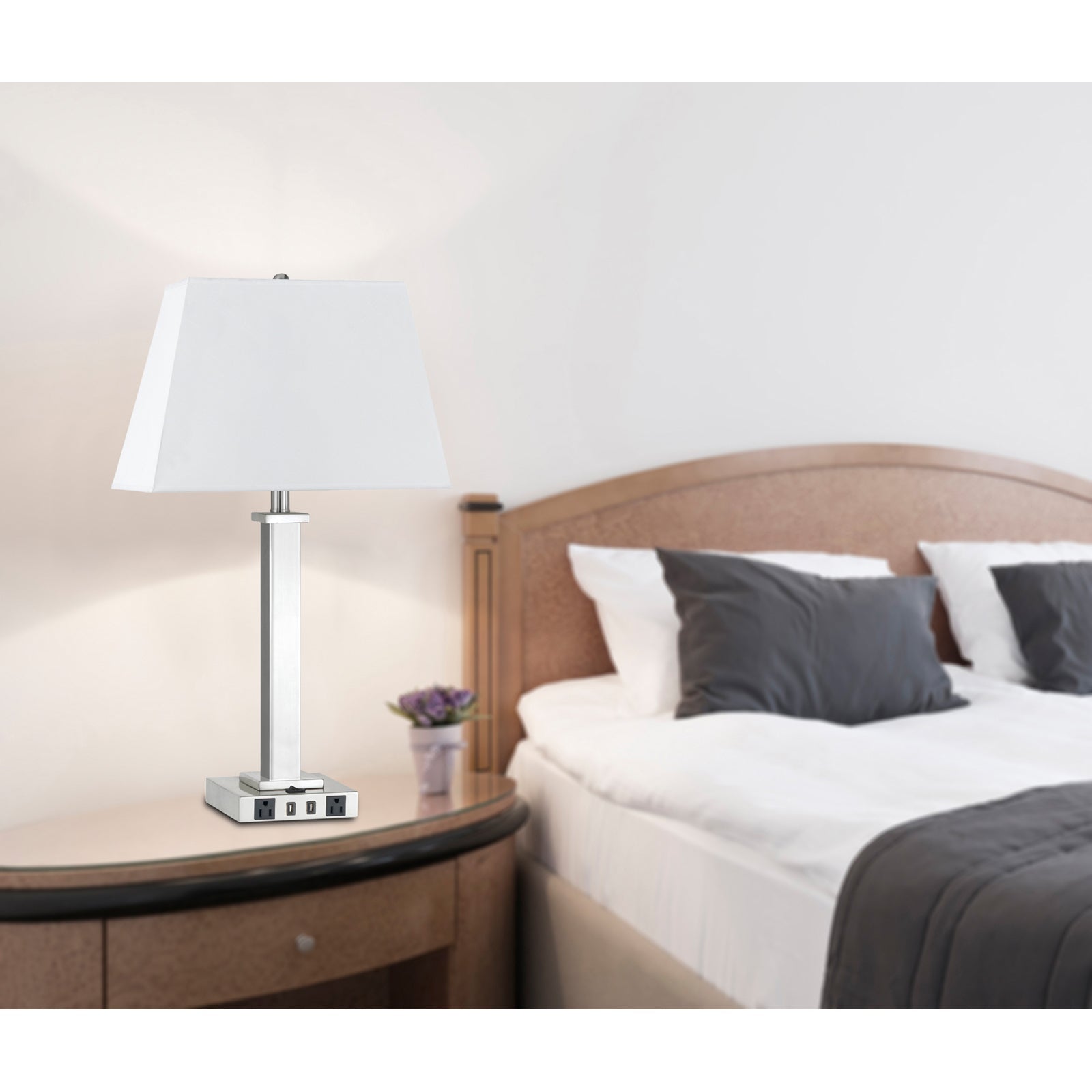 The LA-60003TB-9RBS 100W Metal Night Stand Lamp in Brushed Steel Finish is a perfect blend of functionality and style for your bedroom or living space. Standing at a height of 28 inches, this lamp is designed with durable metal construction and features a sleek rectangular shade. It includes two convenient USB ports and two power outlets, making it easy to charge your devices while enjoying its warm illumination from a maximum 100-watt bulb (not included). The on/off rocker base switch adds to its user-friendly design, making it an essential bedside companion.